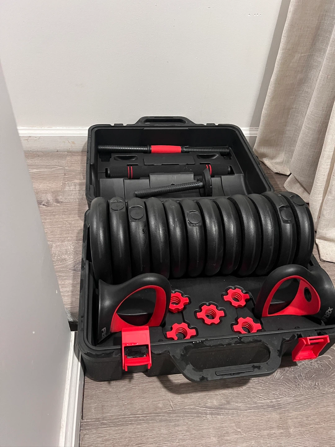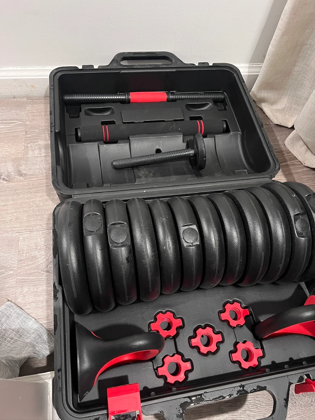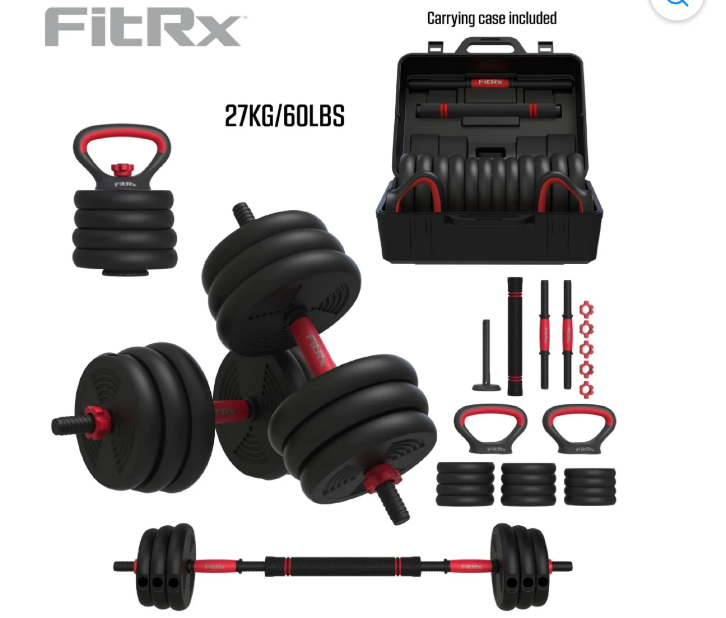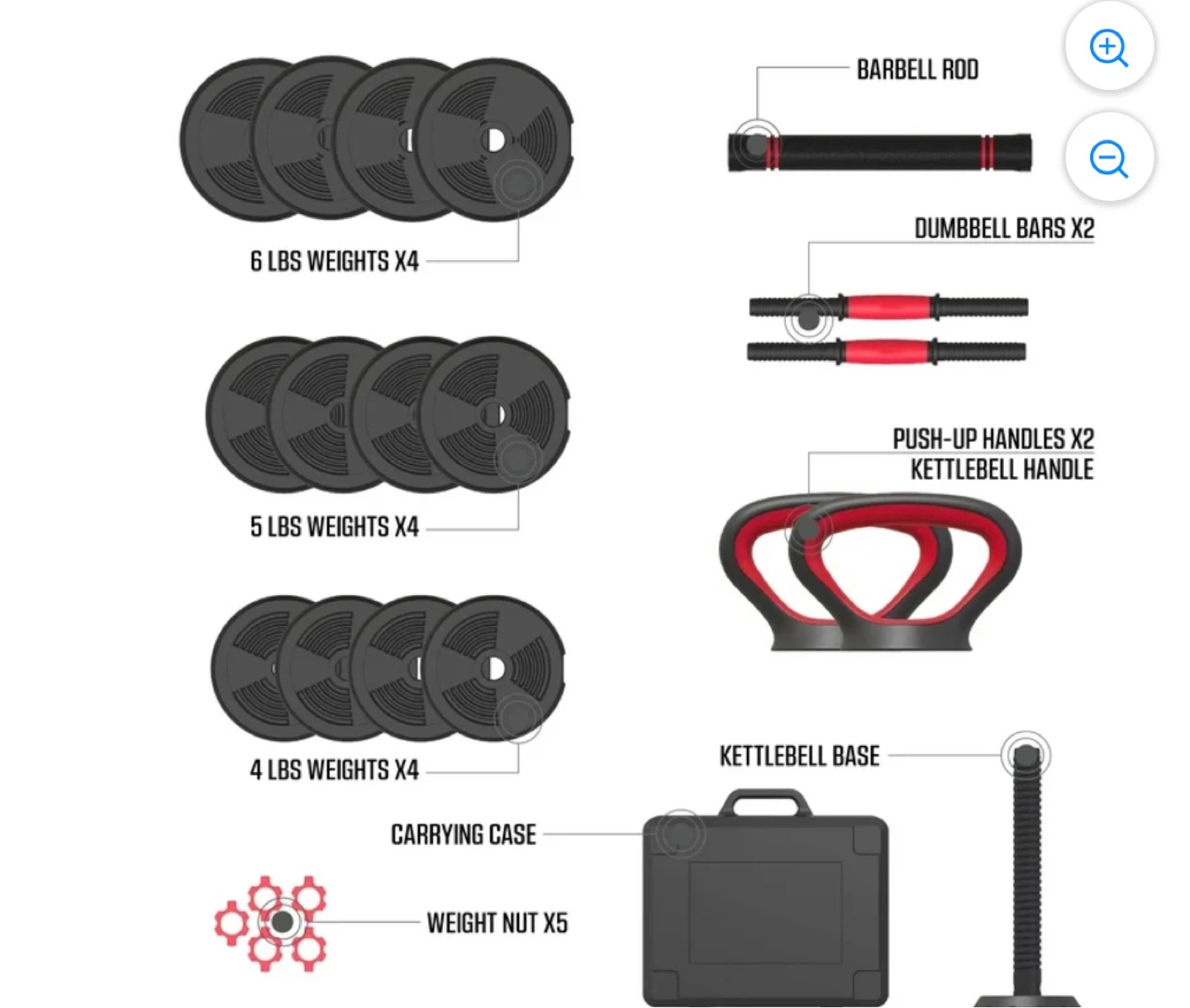 This set includes adjustable dumbbells, kettlebell handle, and barbell connector. It comes in a convenient carrying case. Weights are adjustable up to 60lbs total. These are great for home workouts!