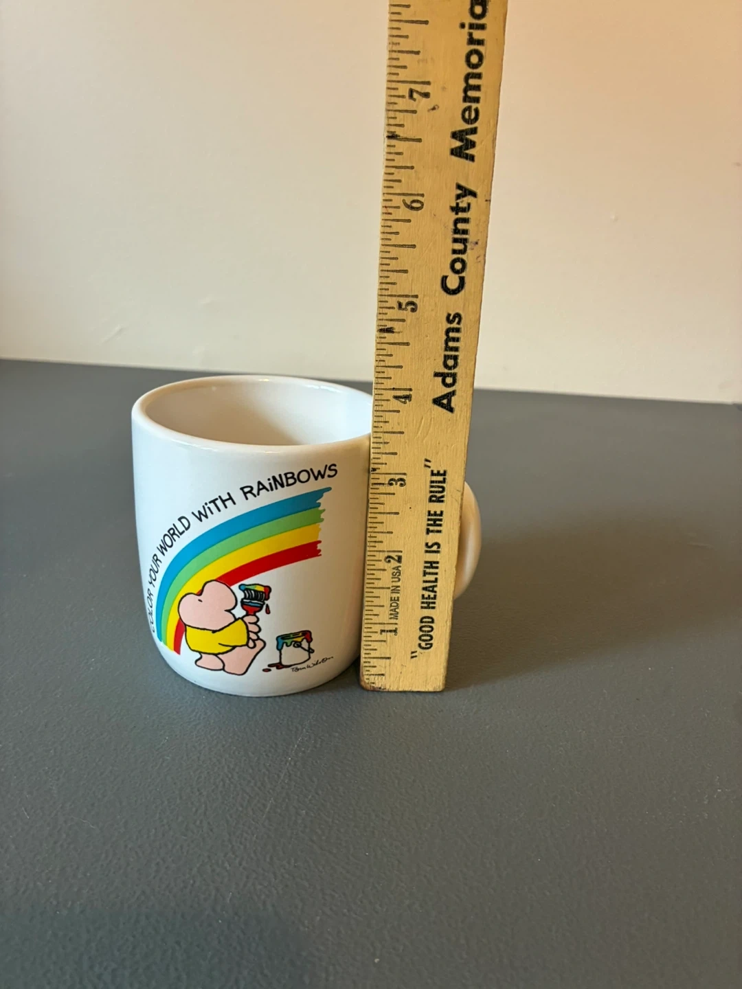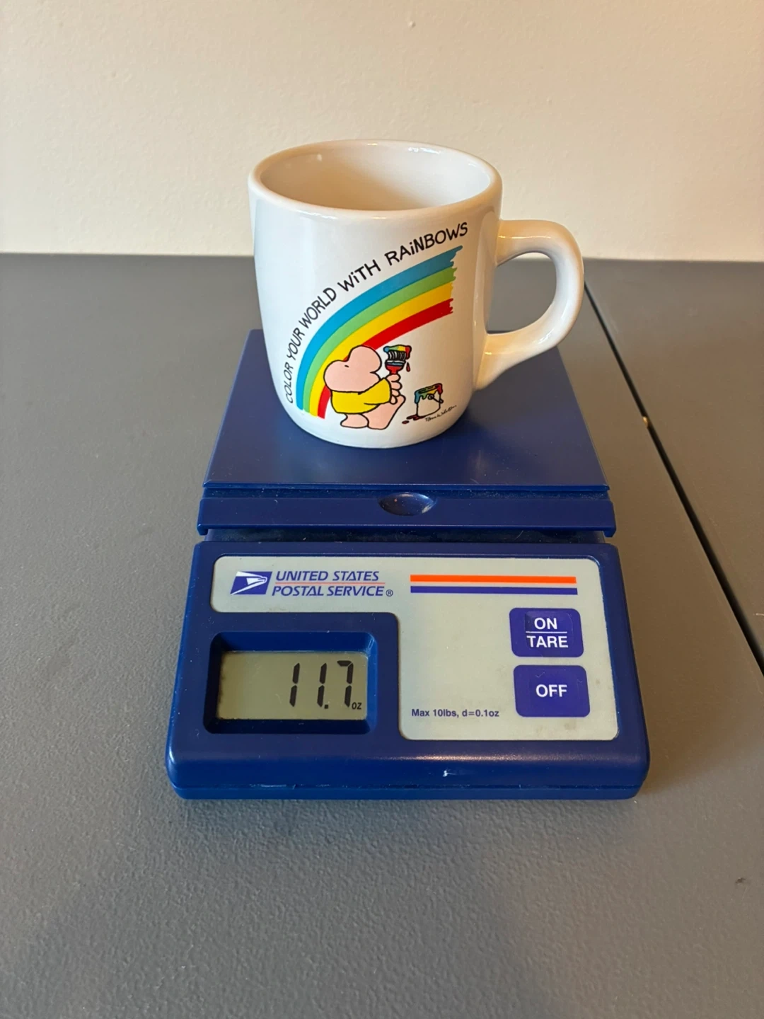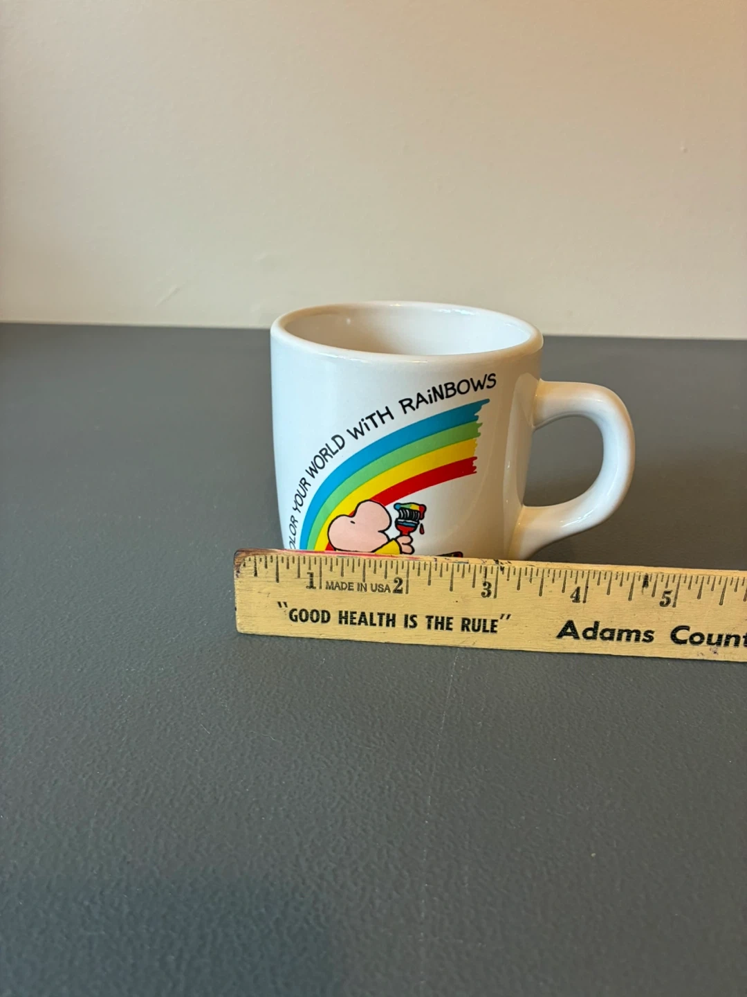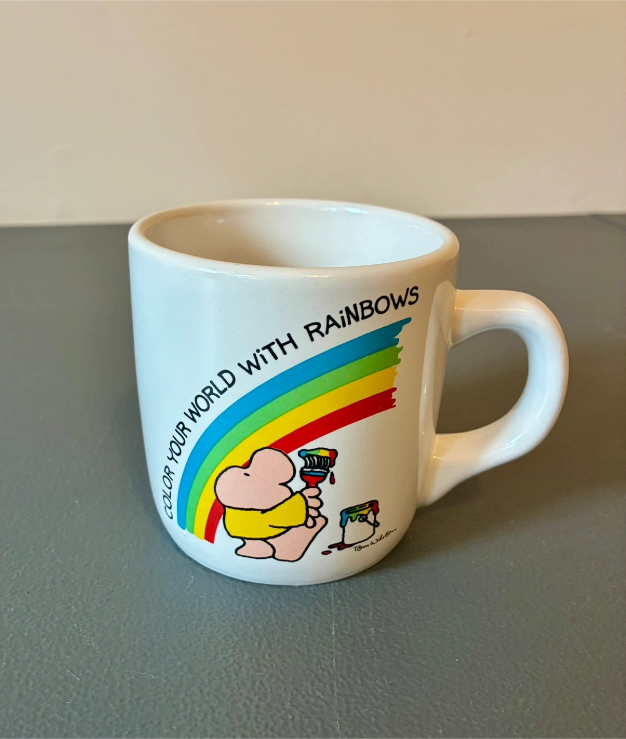 This Ziggy stoneware mug features the "Color Your World with Rainbows" design. It's made in Korea. Perfect for adding a touch of nostalgia to your morning coffee!