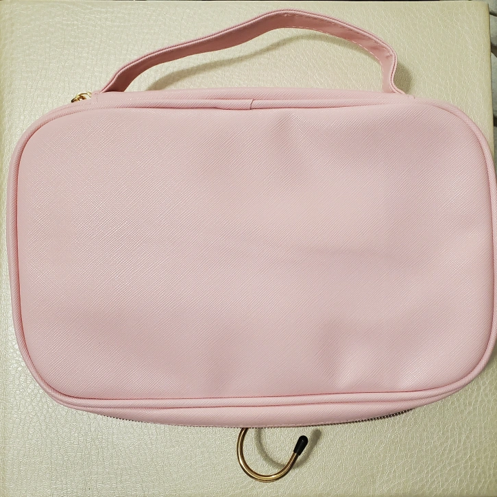 Adorable pink travel jewelry case. Lots of compartments for earrings, necklaces, rings, and more. Perfect for travel or home storage. Features a convenient hanging hook.