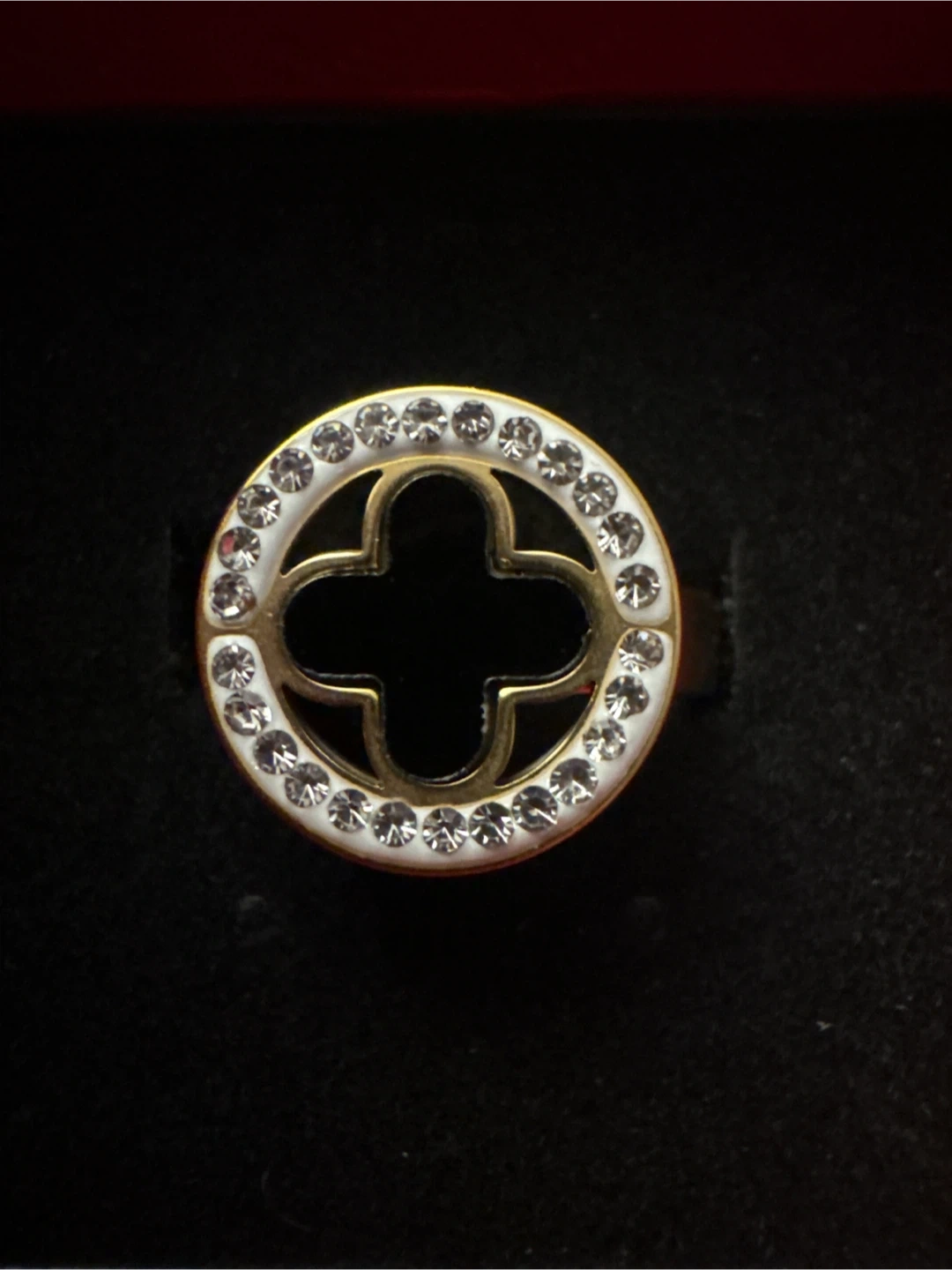 Selling a 18K Gold ring featuring a Black Onyx Clover design surrounded by rhinestones. It comes in a box