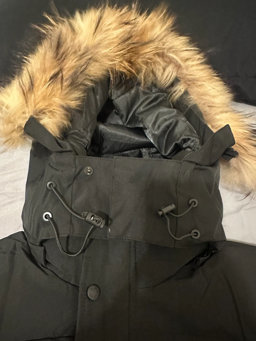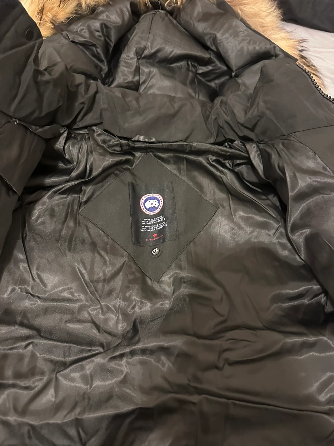 Selling a black Canada Goose winter parka. It's in great condition and ready to keep you warm this winter! The parka features the classic Canada Goose logo patch and a fur-trimmed hood.