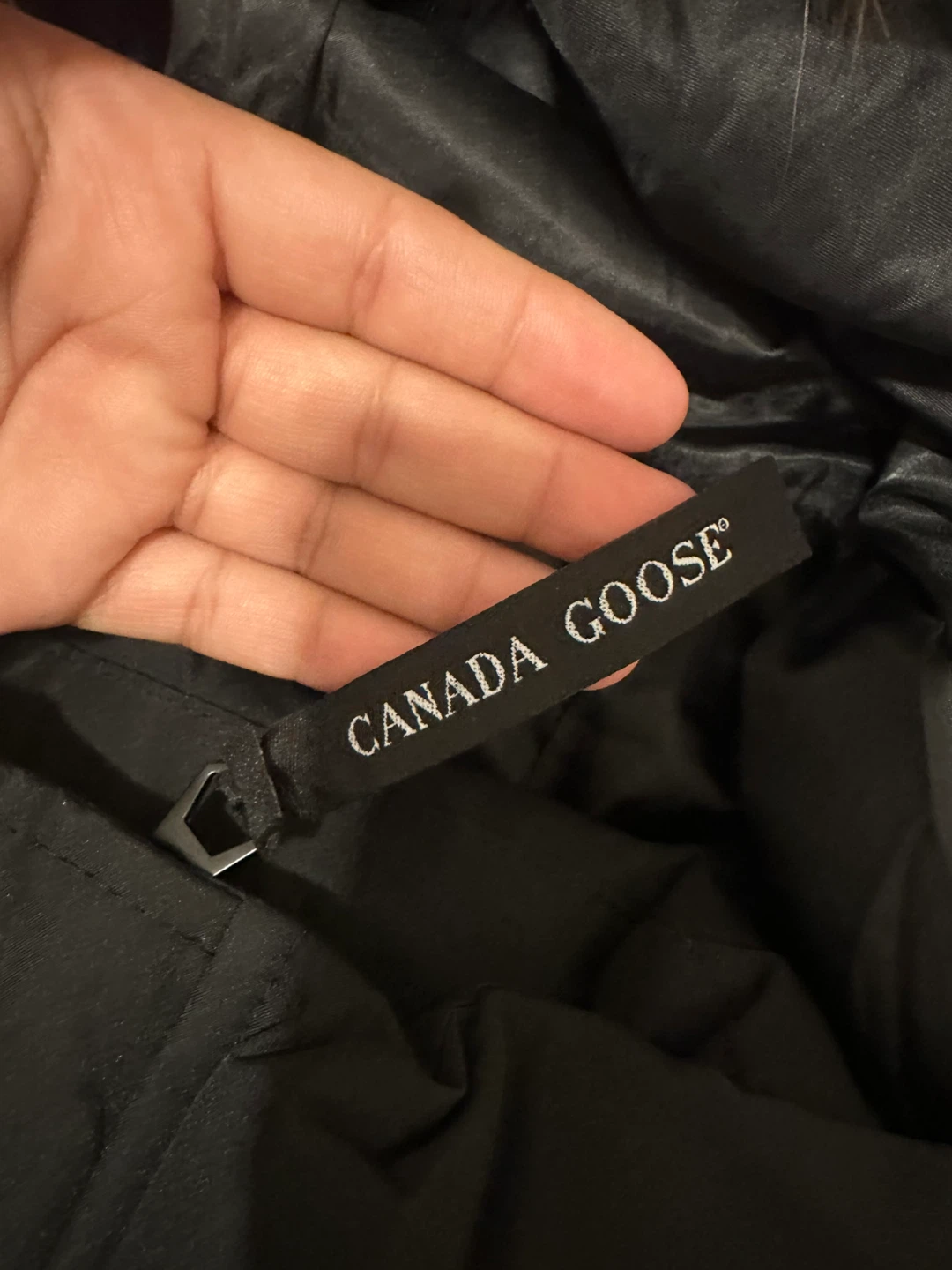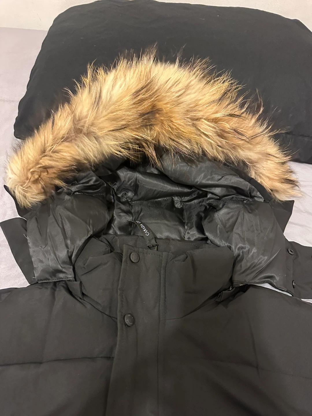 Selling a black Canada Goose winter parka. It's in great condition and ready to keep you warm this winter! The parka features the classic Canada Goose logo patch and a fur-trimmed hood.