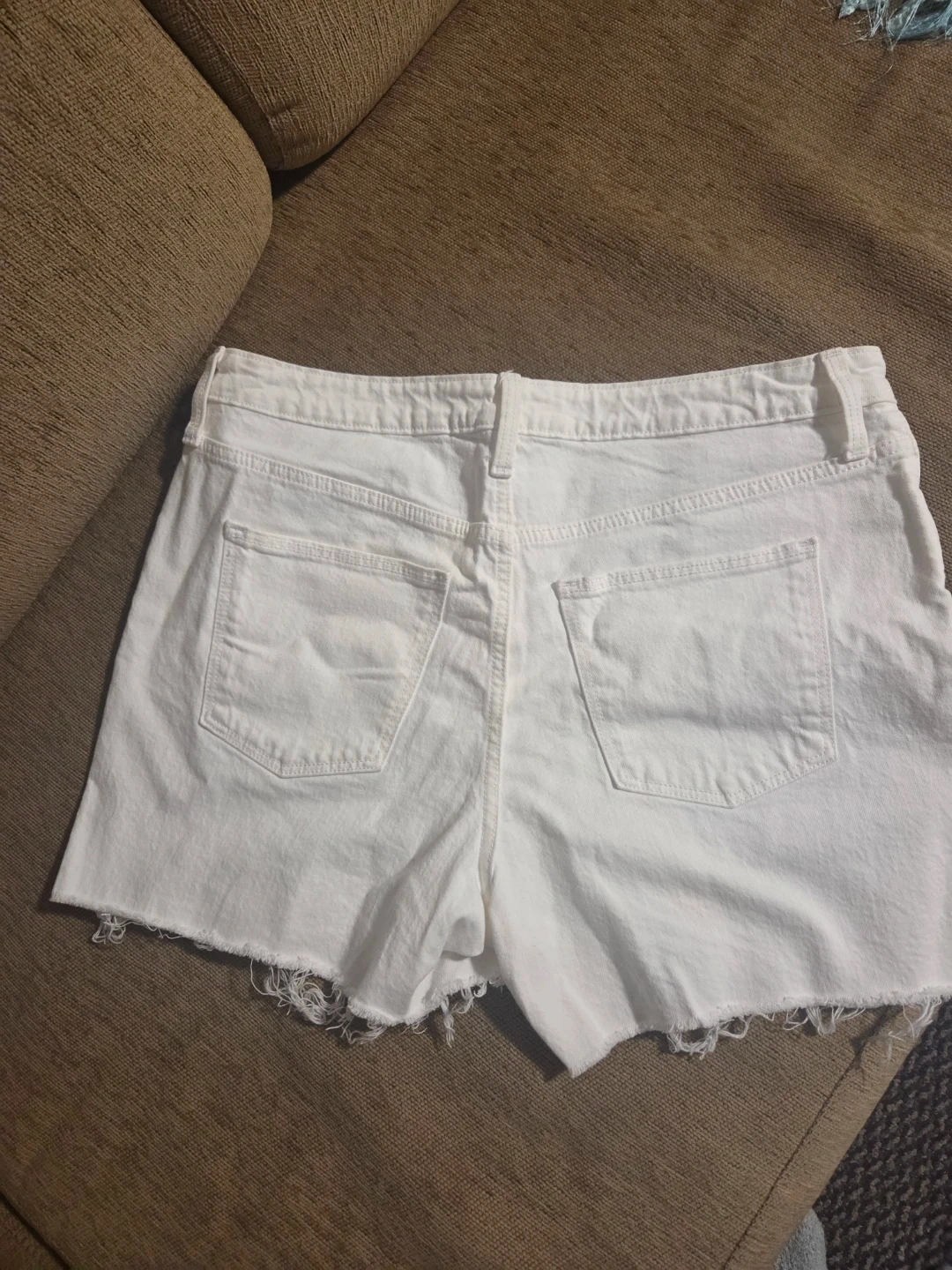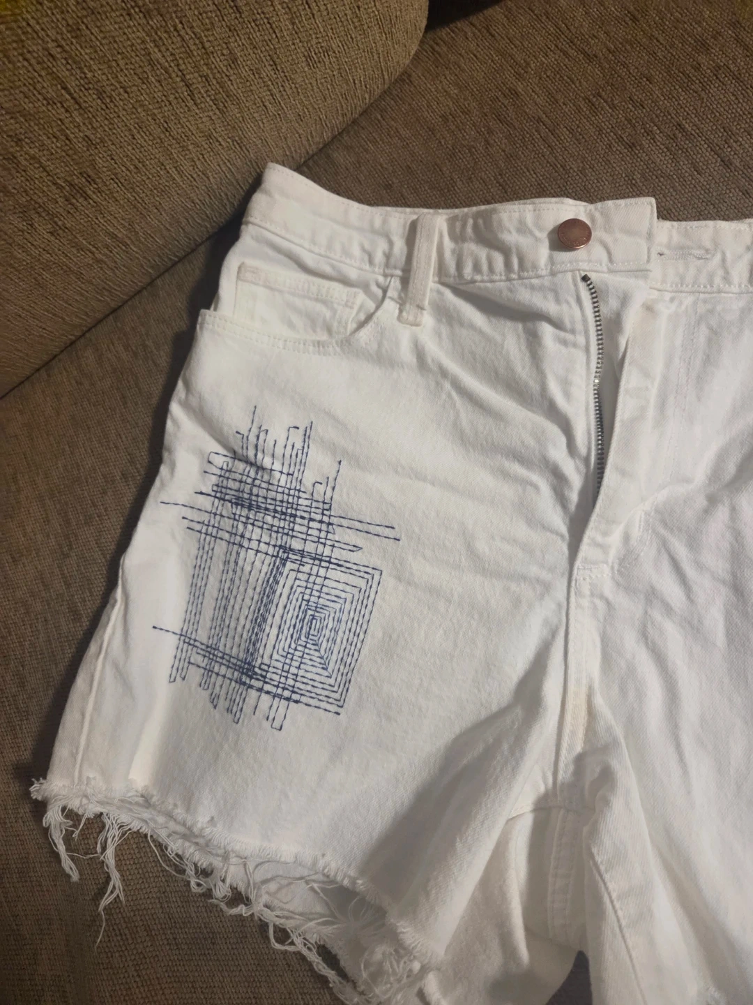 These white denim cutoff shorts feature unique blue embroidery detail on the front leg. They have a frayed hemline and classic 5-pocket styling. Cotton blend material.