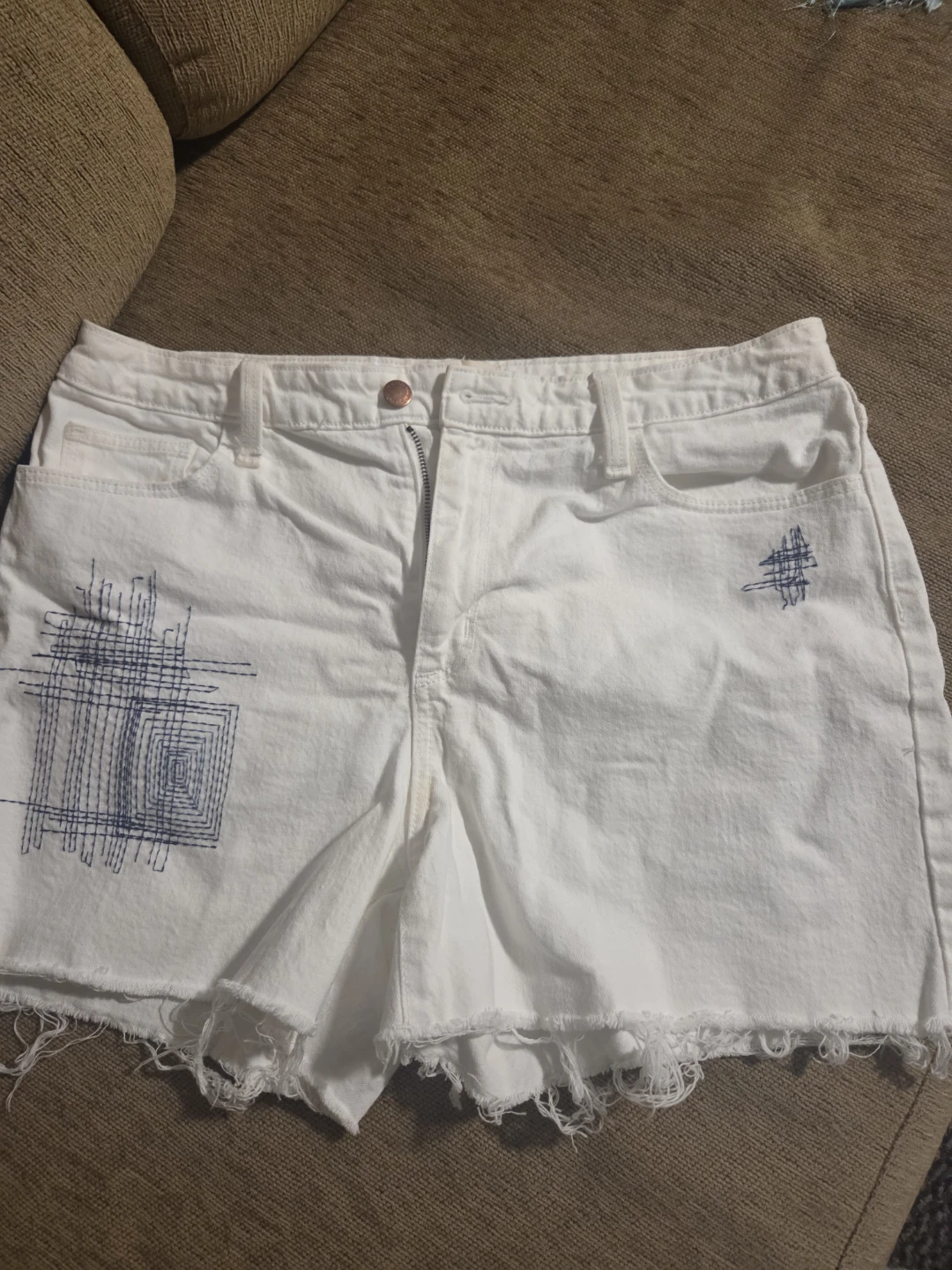 These white denim cutoff shorts feature unique blue embroidery detail on the front leg. They have a frayed hemline and classic 5-pocket styling. Cotton blend material.