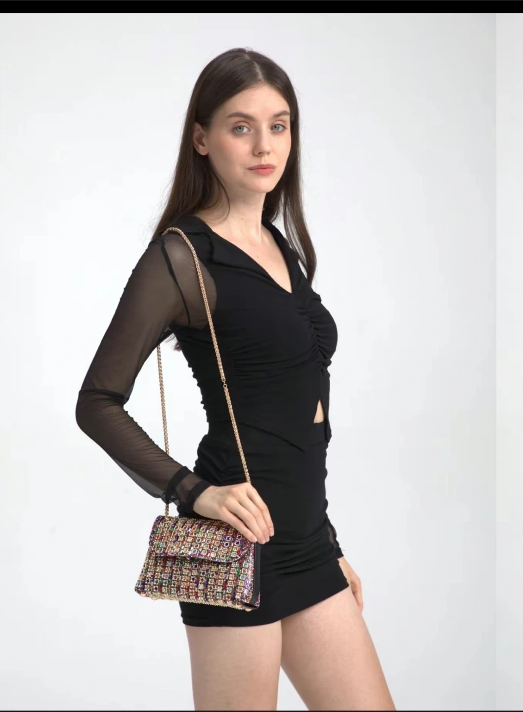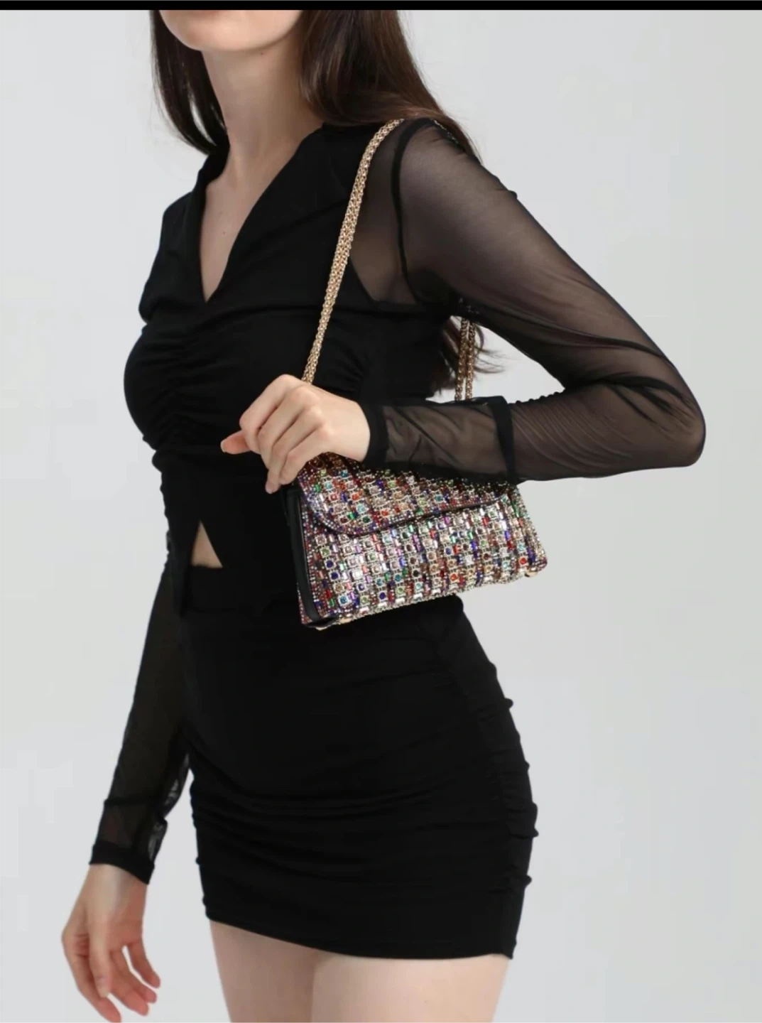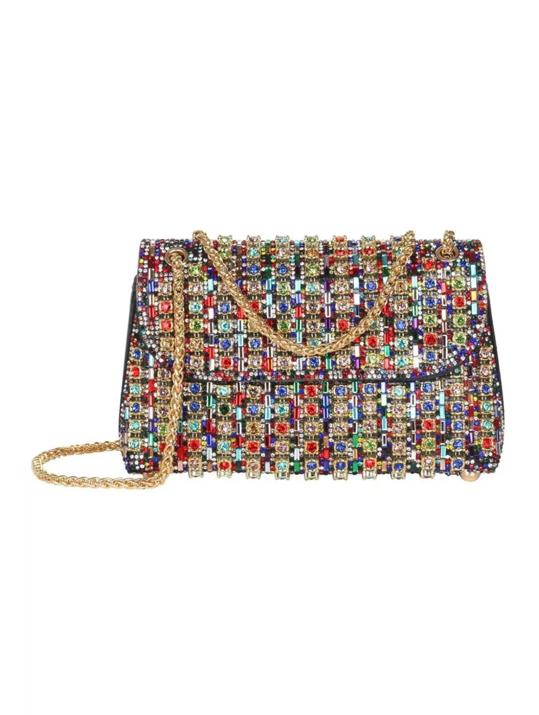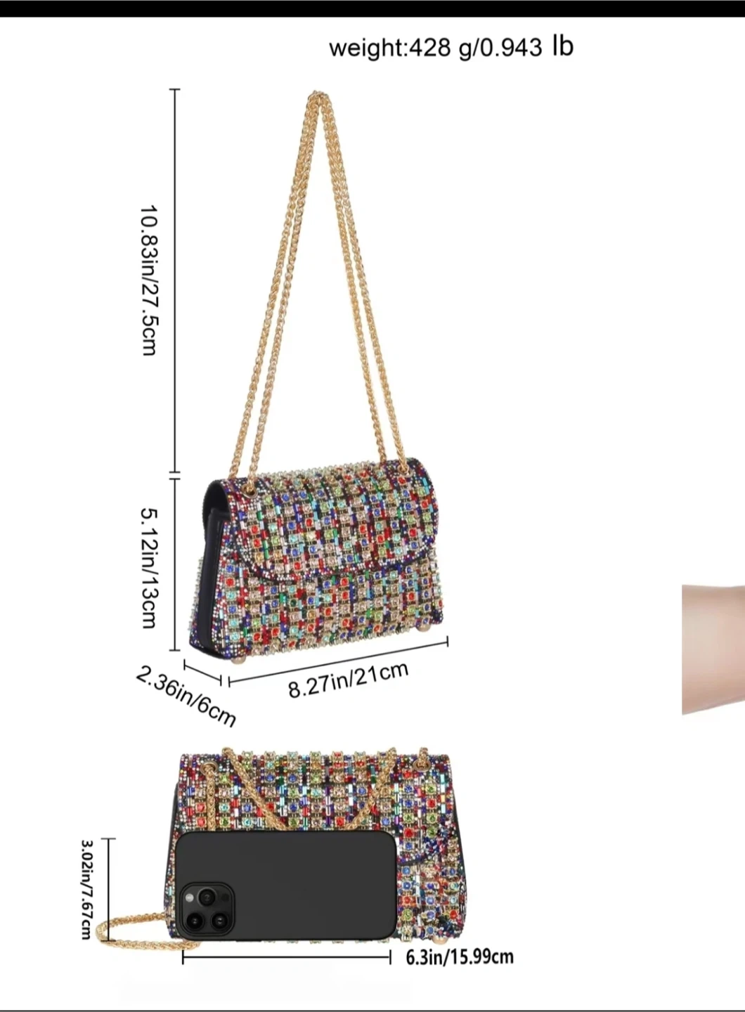 This colorful tweed chain shoulder bag is so cute! It has a gold chain and is a great size for carrying your essentials. The bag measures approximately 10.83 inches in height, 8.27 inches in width, and 2.36 inches in depth. It weighs about 0.943 lb