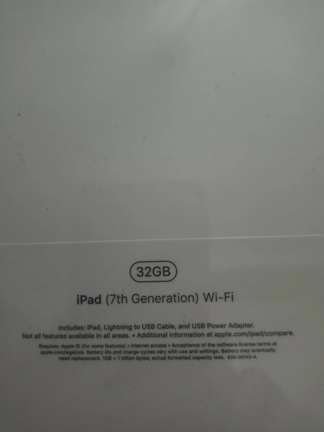 Apple iPad (7th Generation) Wi-Fi with 32GB storage. Includes the iPad, Lightning to USB Cable, and USB Power Adapter. Battery life and charge cycles vary with use and settings.