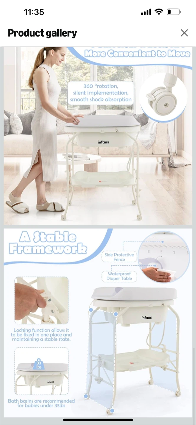 This is an Infans 2 in 1 baby changing table with a tub unit. It's white and has a folding diaper dresser station with wheels. It's designed for convenience and stability, featuring 360° rotation, smooth shock absorption, and a stable framework with a side protective fence. It also has a waterproof diaper table, a body wash shelf, an automatic drain, and a high-capacity storage basket