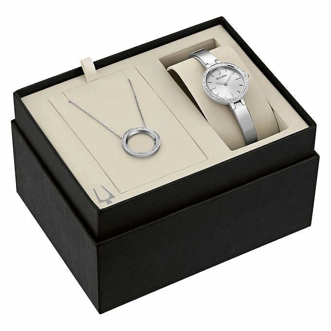 Bulova Stainless Steel Ladies Watch and Crystal Halo Pendant Set