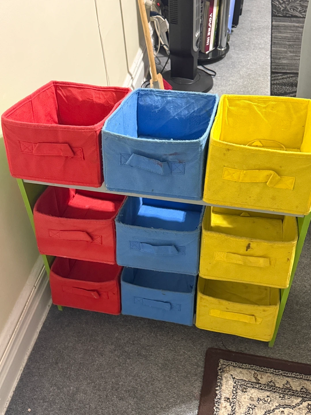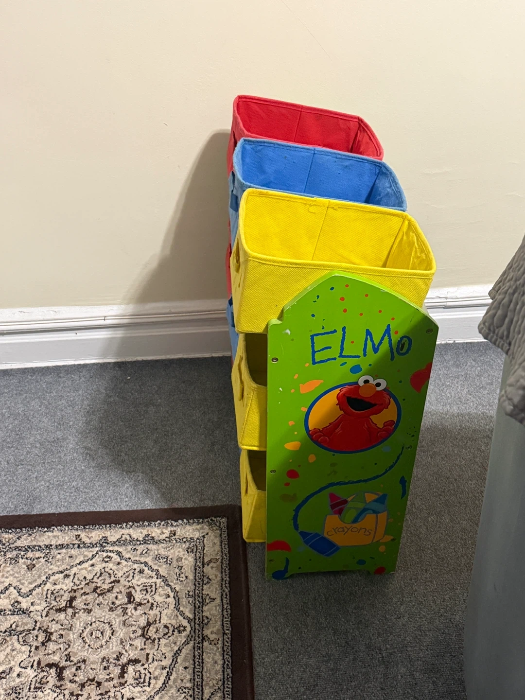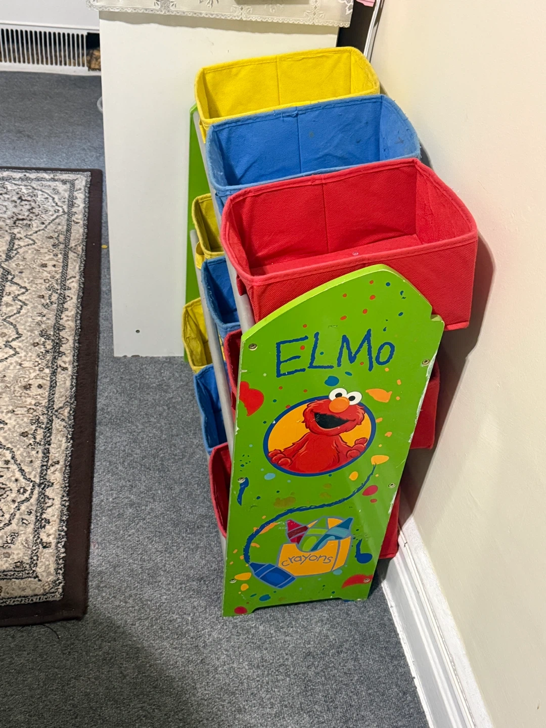 Selling an Elmo-themed kids' storage shelf! It features bright and colorful bins in red, blue, and yellow. Perfect for organizing toys, books, and more in a fun way