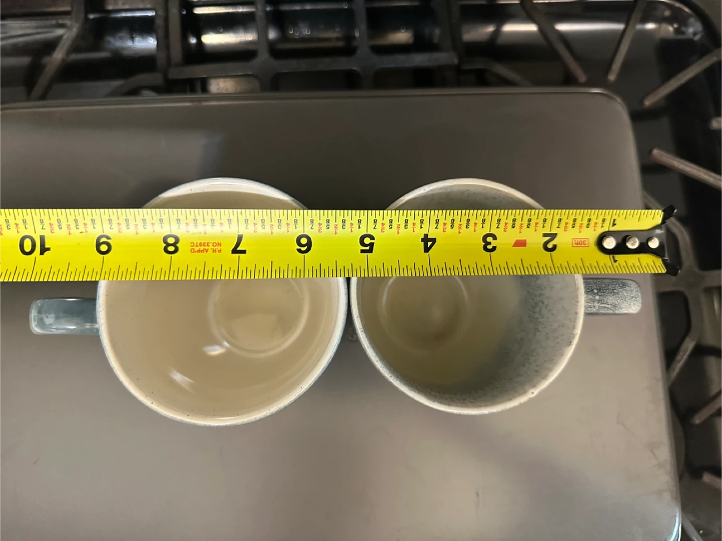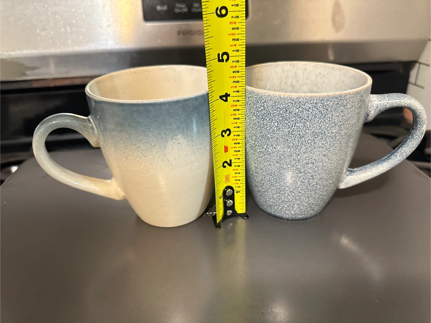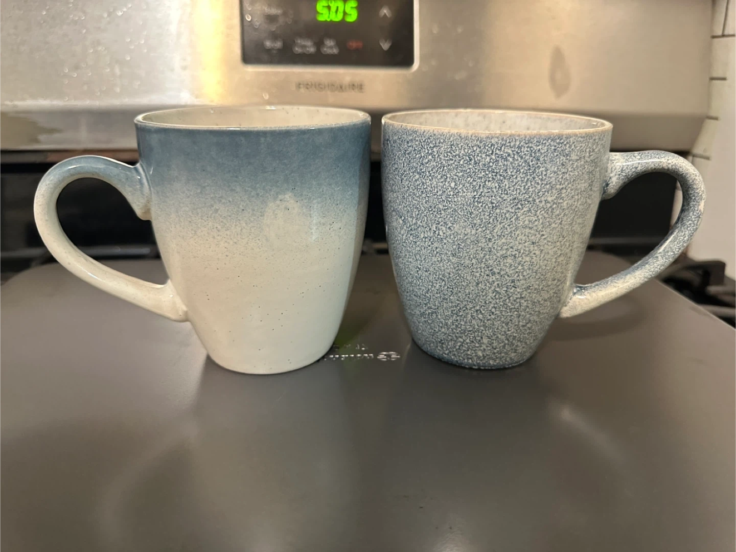Selling a set of two stoneware mugs from the Signature Collection! One mug features a beautiful blue ombre design, while the other has a speckled blue pattern. They are approximately 4 inches in diameter and 5.5 inches tall.