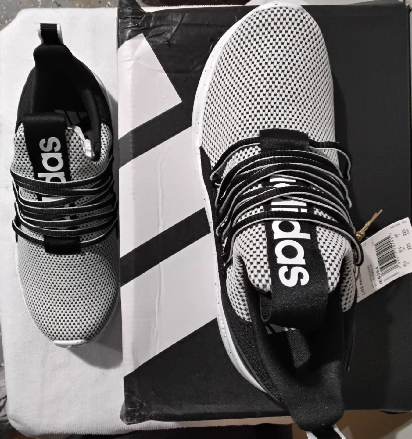 Adidas Lite Racer Adapt 4.0 running shoes in black and white. Features a slip-on design with elastic laces and Cloudfoam cushioning. Includes original box. These shoes are great for everyday wear and light workouts.