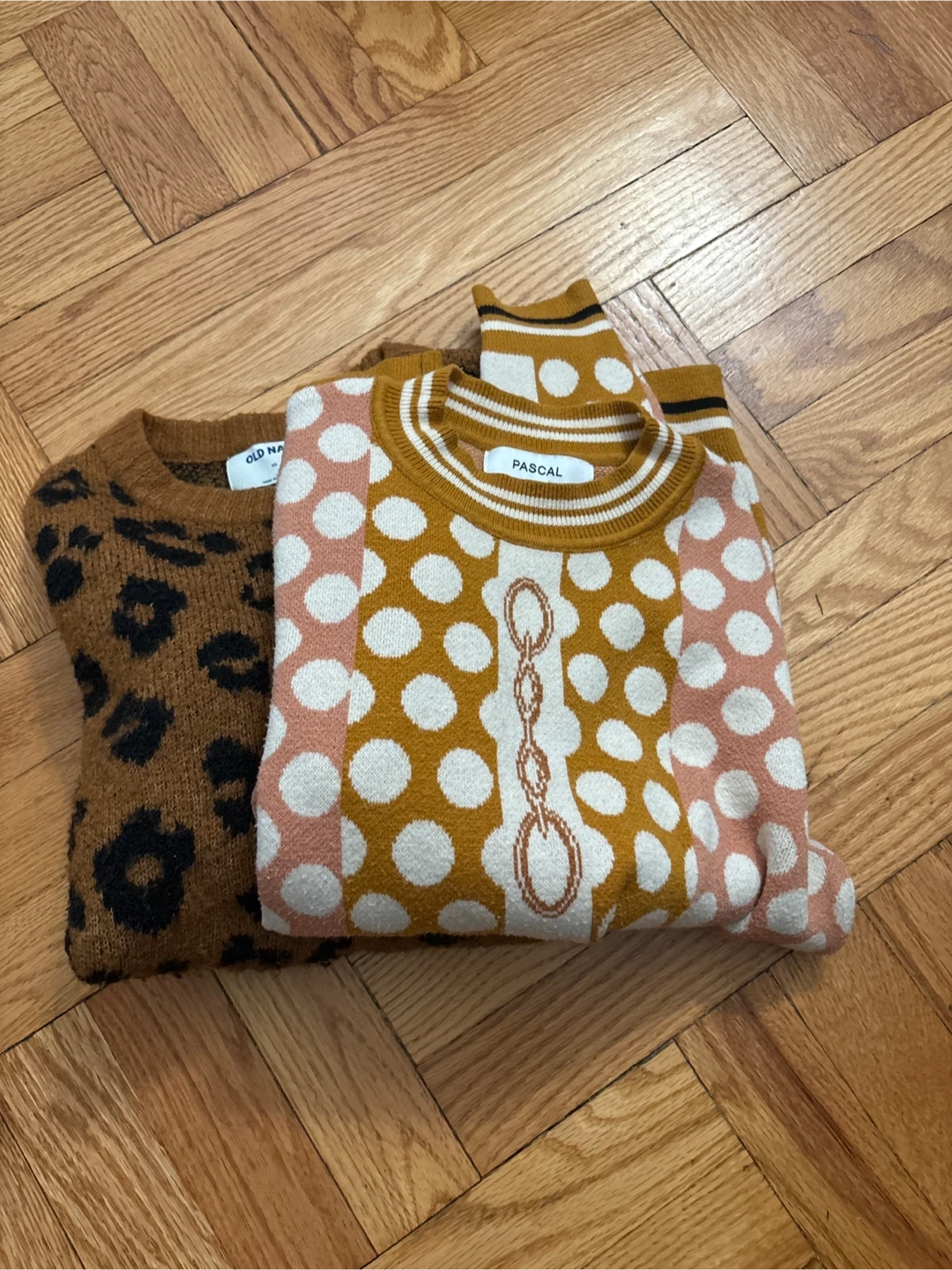 Two cozy sweaters for your wardrobe. One features a brown leopard print from Old Navy. The other has a colorful polka dot design with a chain detail and the name Pascal on the tag. Both sweaters are perfect for casual wear.