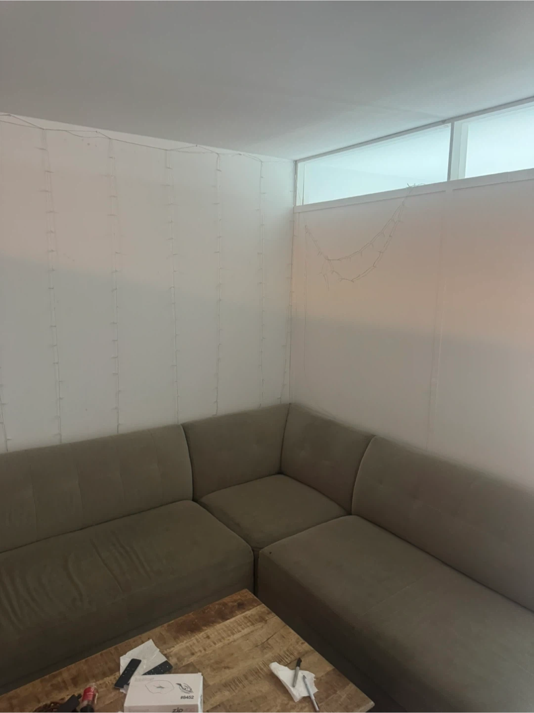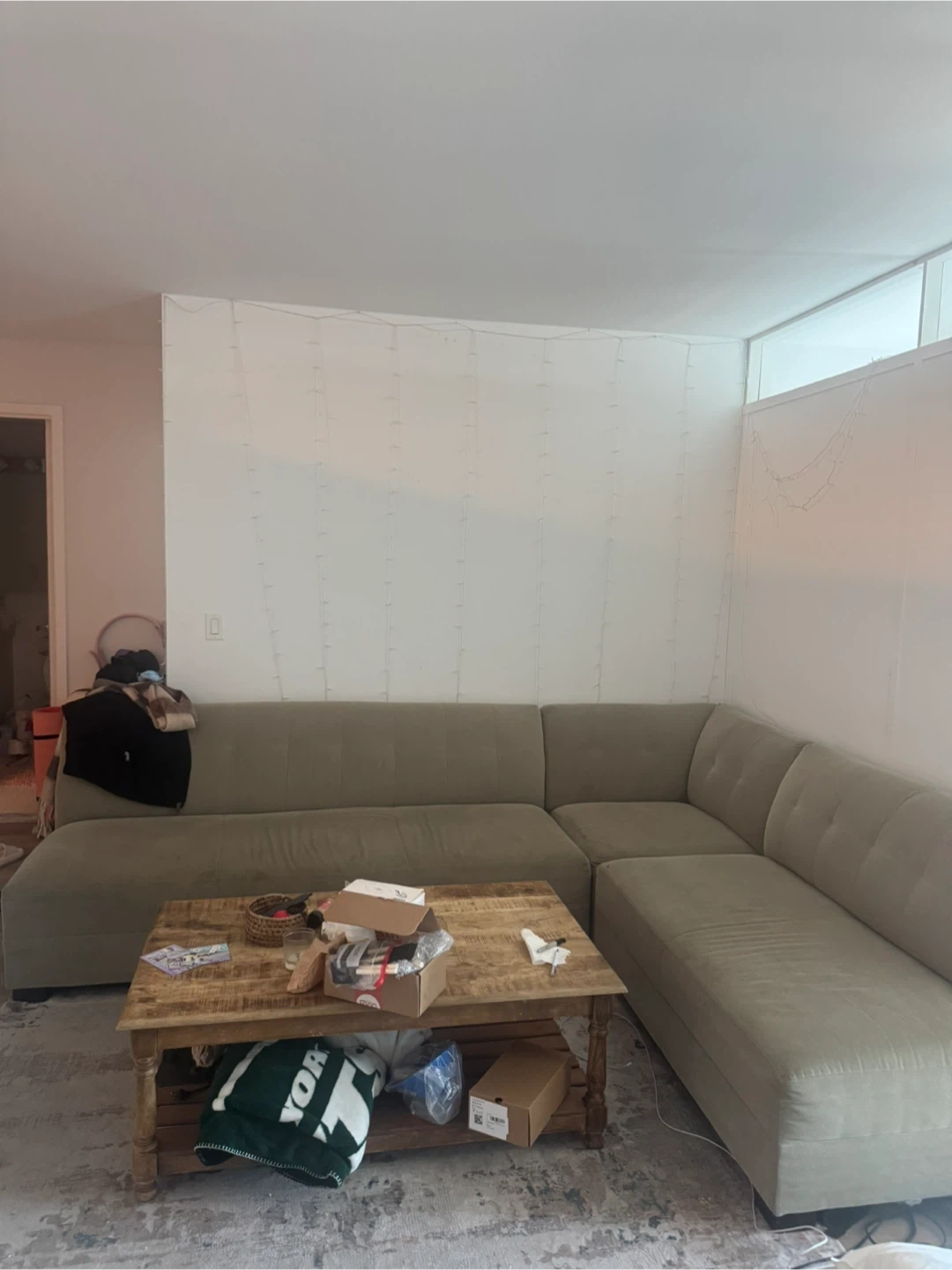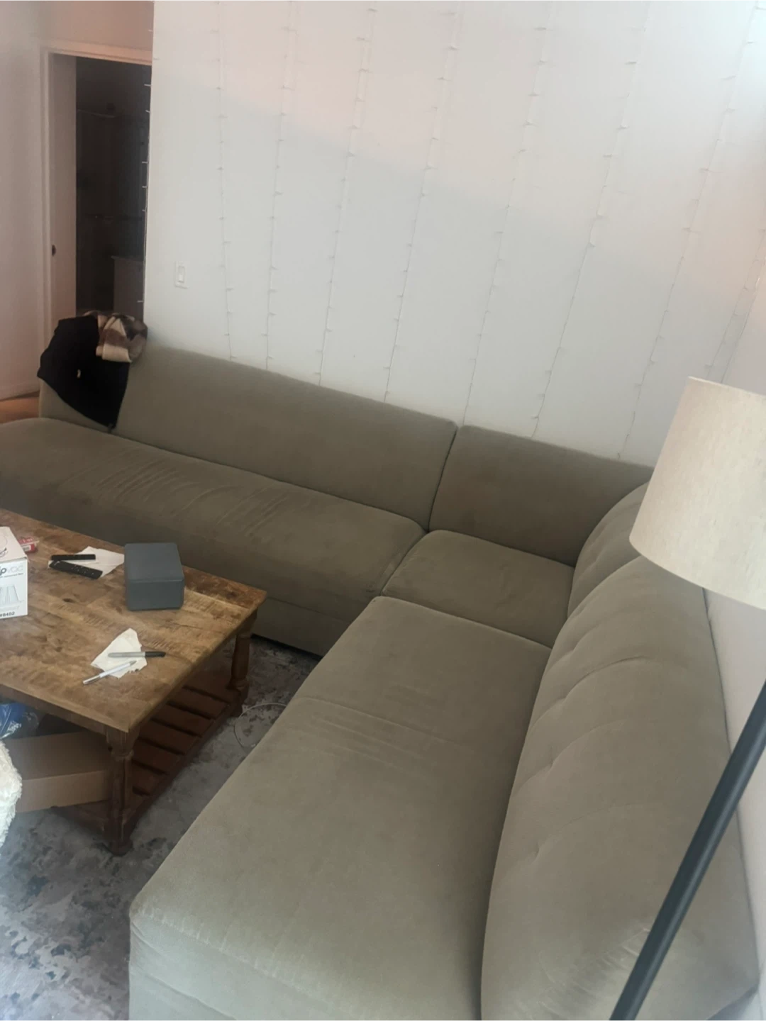 Olive colored sectional couch in good condition. No pilling, there are some minor stains but they are def cleanable. The pieces can be rearranged. Dimensions: 76", 36x36", 54". Seat depth is 24". This is in an elevator building with a service elevator for furniture. Must be picked up by 2/26.