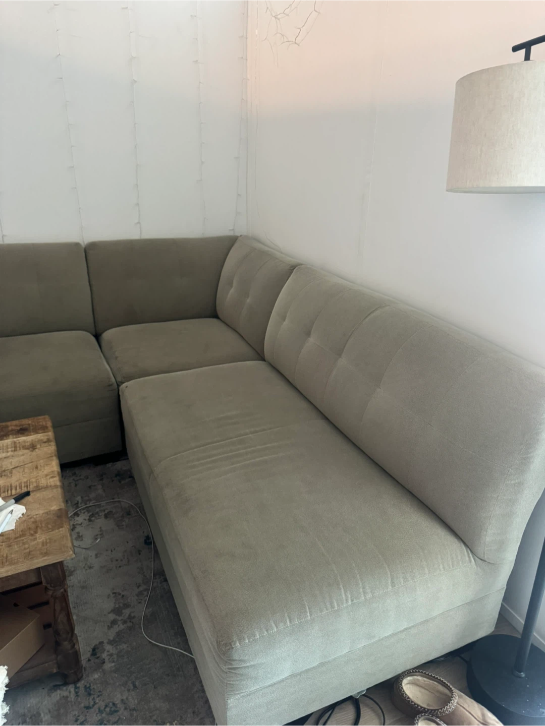 Olive colored sectional couch in good condition. No pilling, there are some minor stains but they are def cleanable. The pieces can be rearranged. Dimensions: 76", 36x36", 54". Seat depth is 24". This is in an elevator building with a service elevator for furniture. Must be picked up by 2/26.