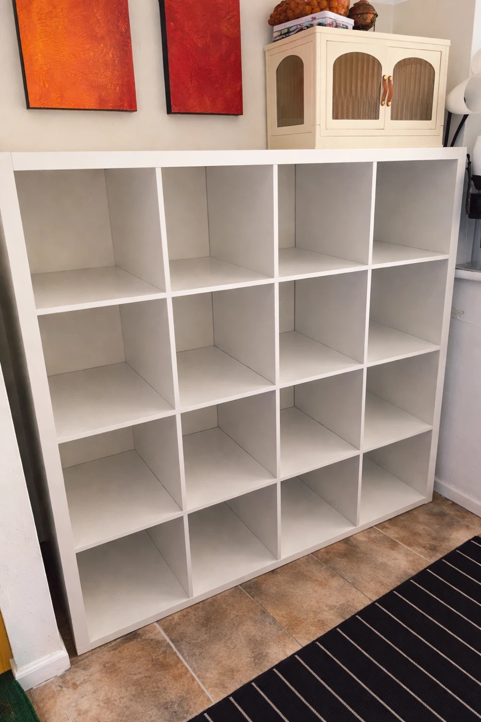 This is a white cube storage shelf. It has 16 individual cubbies. Great for organizing books, toys, or other household items!