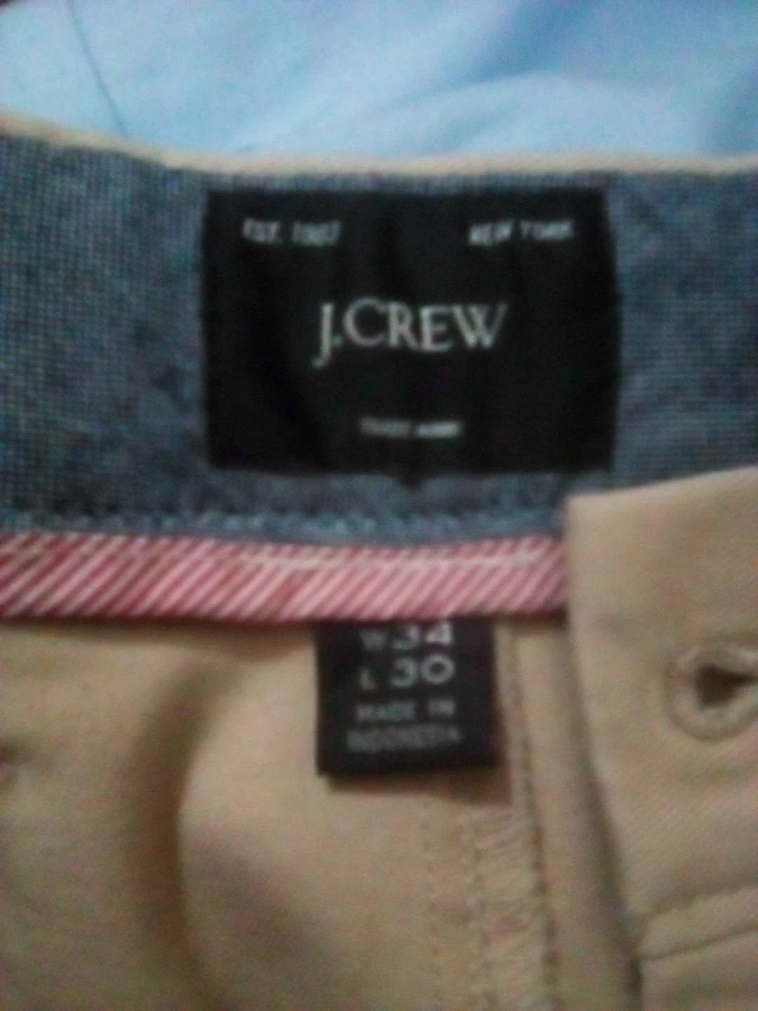 These J. Crew chinos are in a straight fit and size 34 waist by 30 inseam. They're a versatile tan color, perfect for everyday wear. Made in Indonesia.