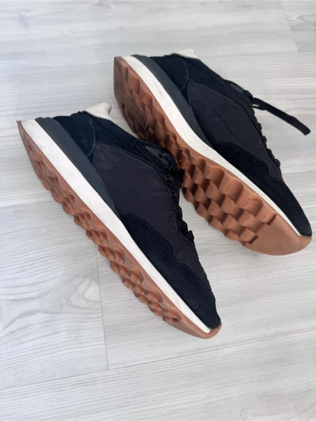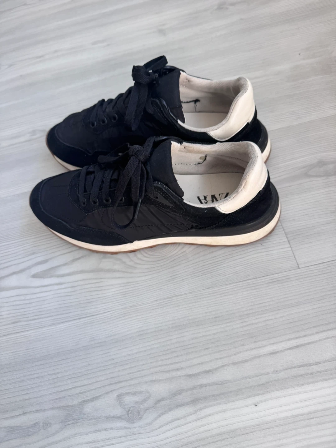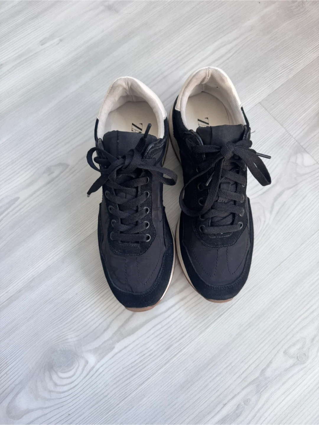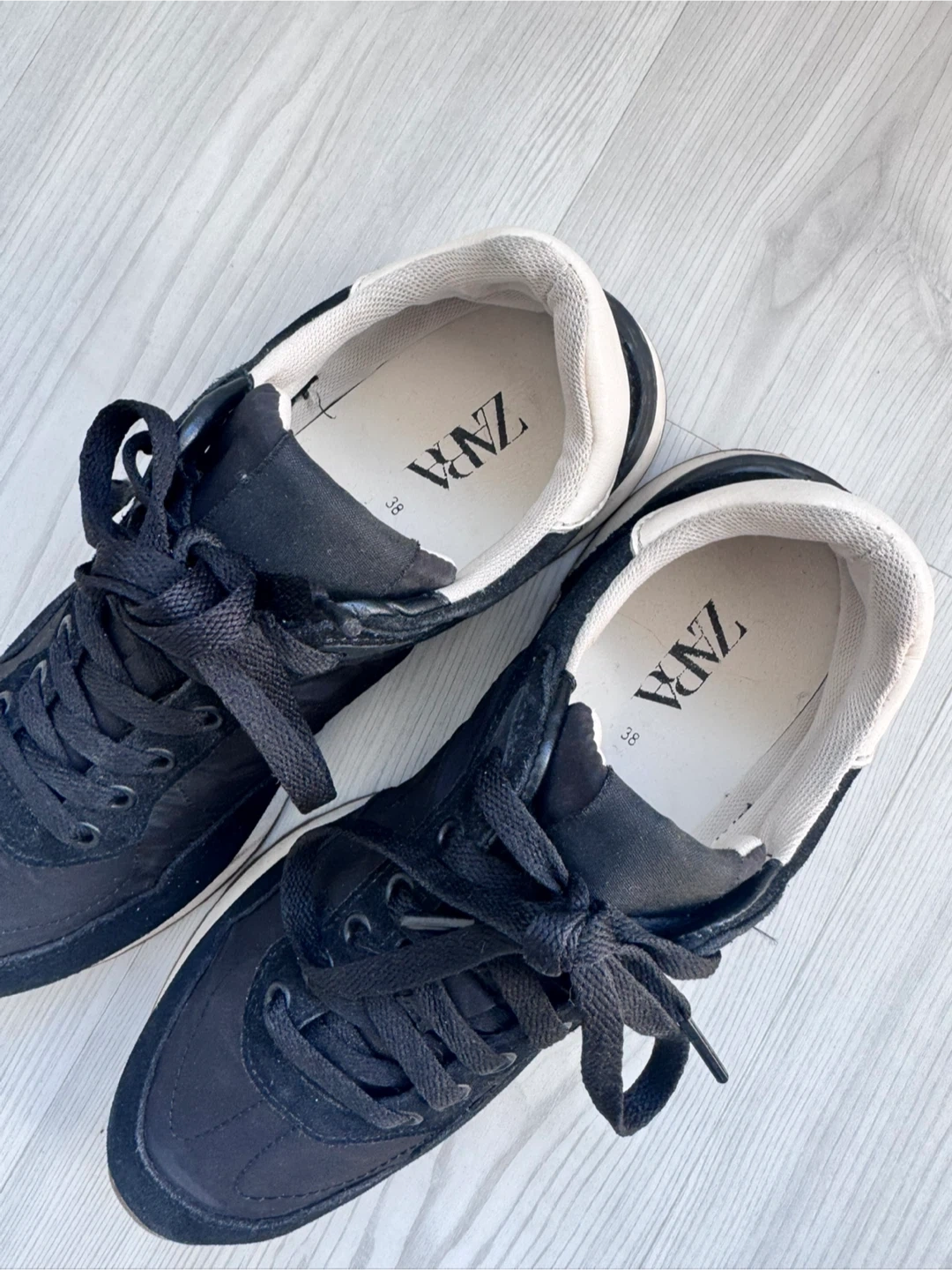 These are black Zara sneakers in a size 38. They're made with a mix of suede and fabric. The soles are rubber with a treaded pattern. Excellent condition.