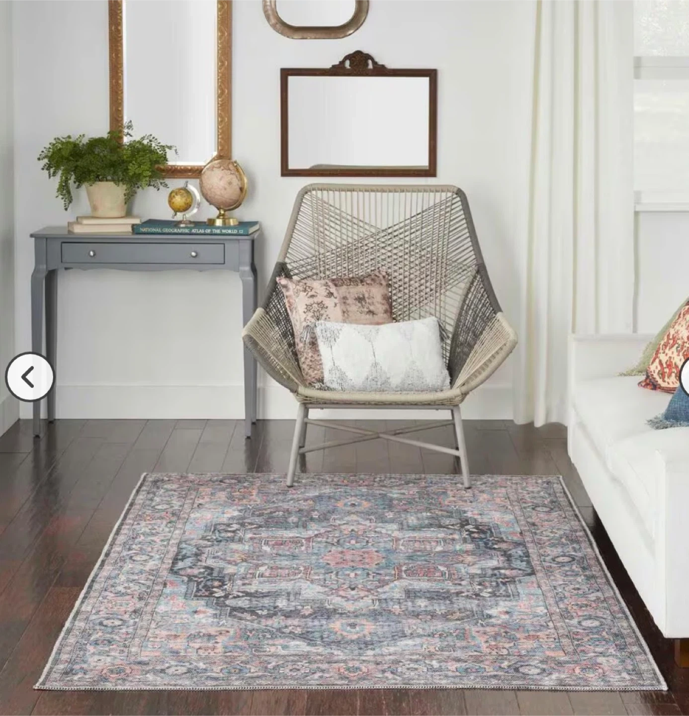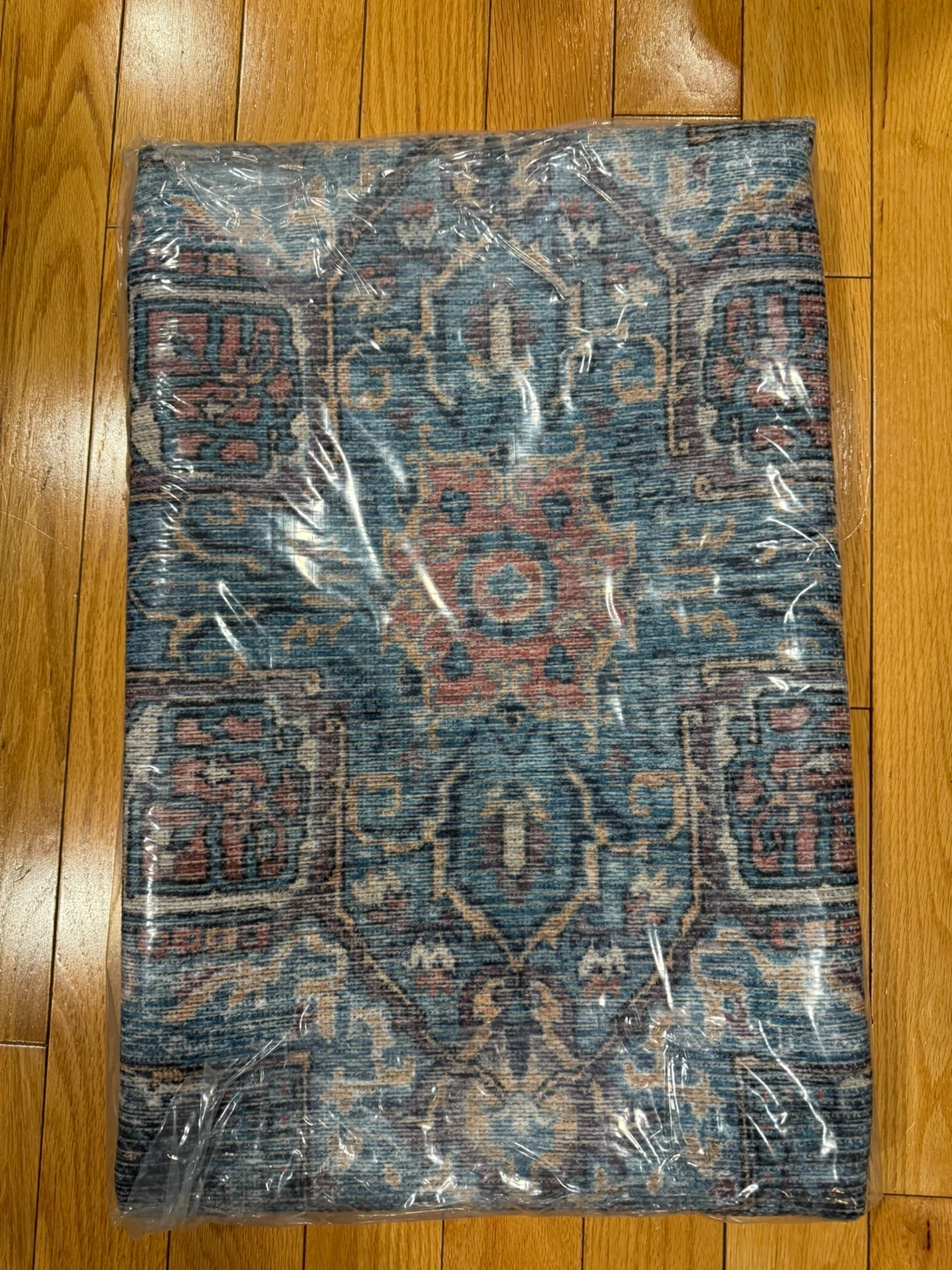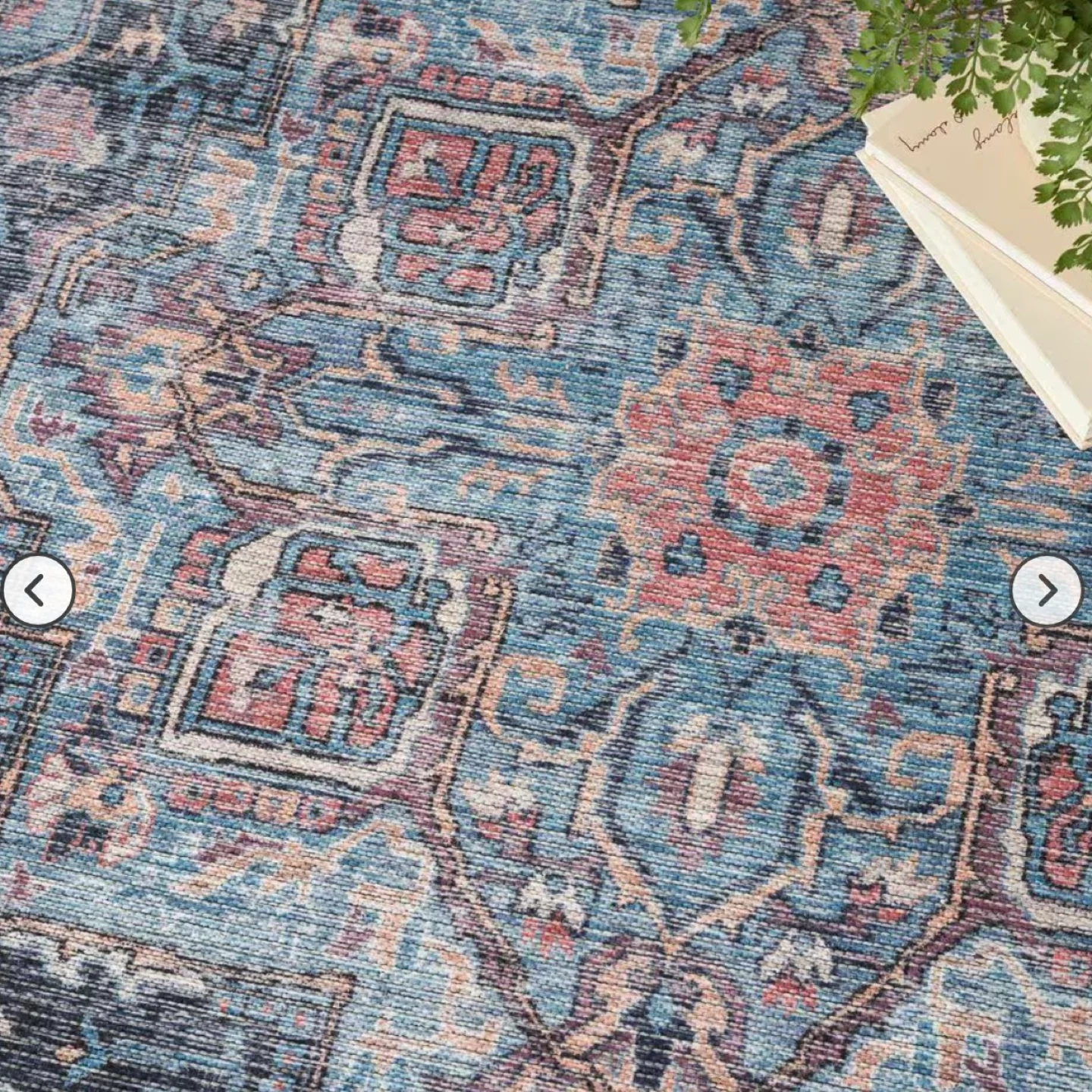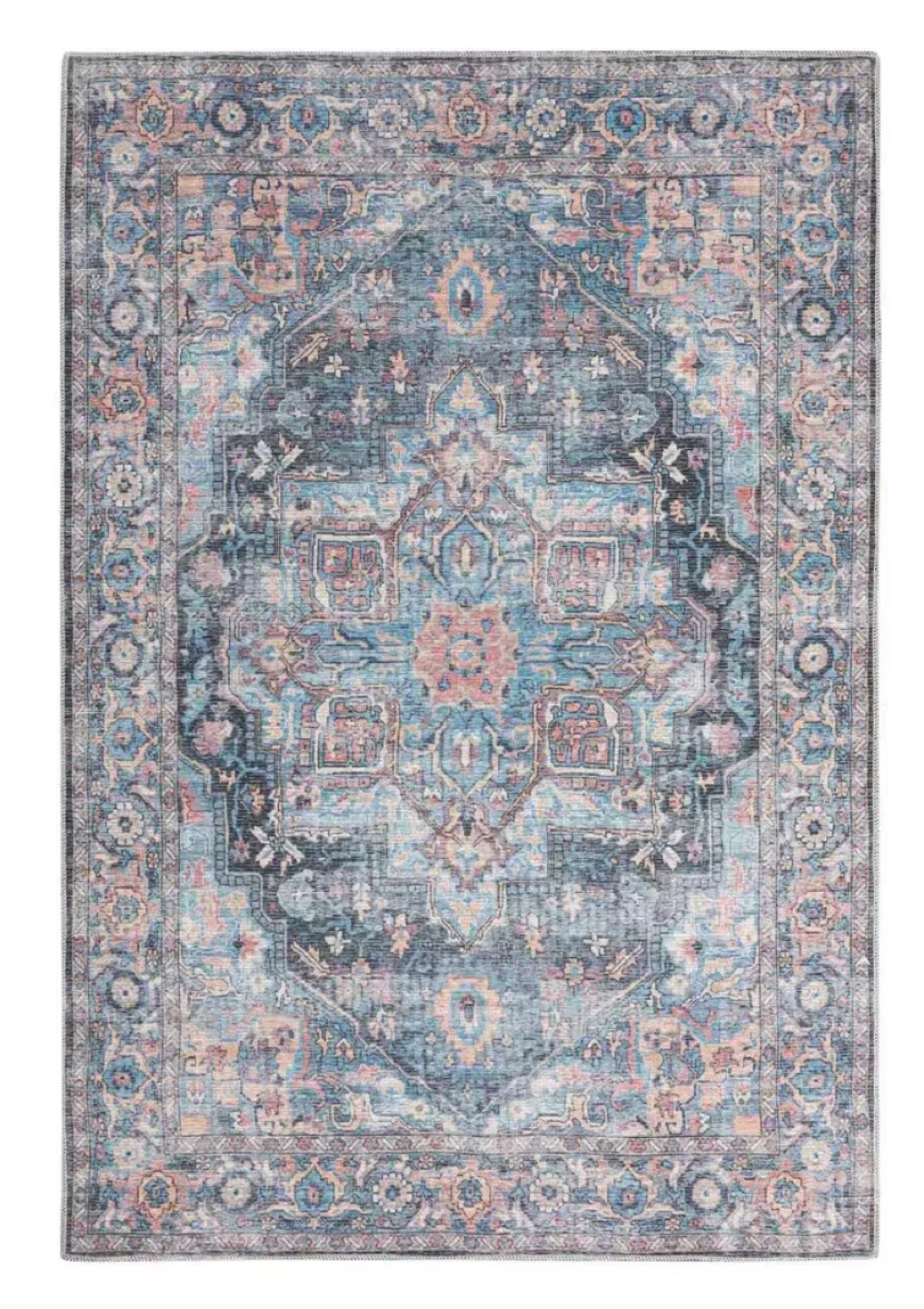 This 4' x 6' area rug features a distressed blue, beige, and pink pattern. It's made with a soft material for comfort. The rug's design adds a vintage touch to any room. It's a great size for entryways or smaller living spaces!