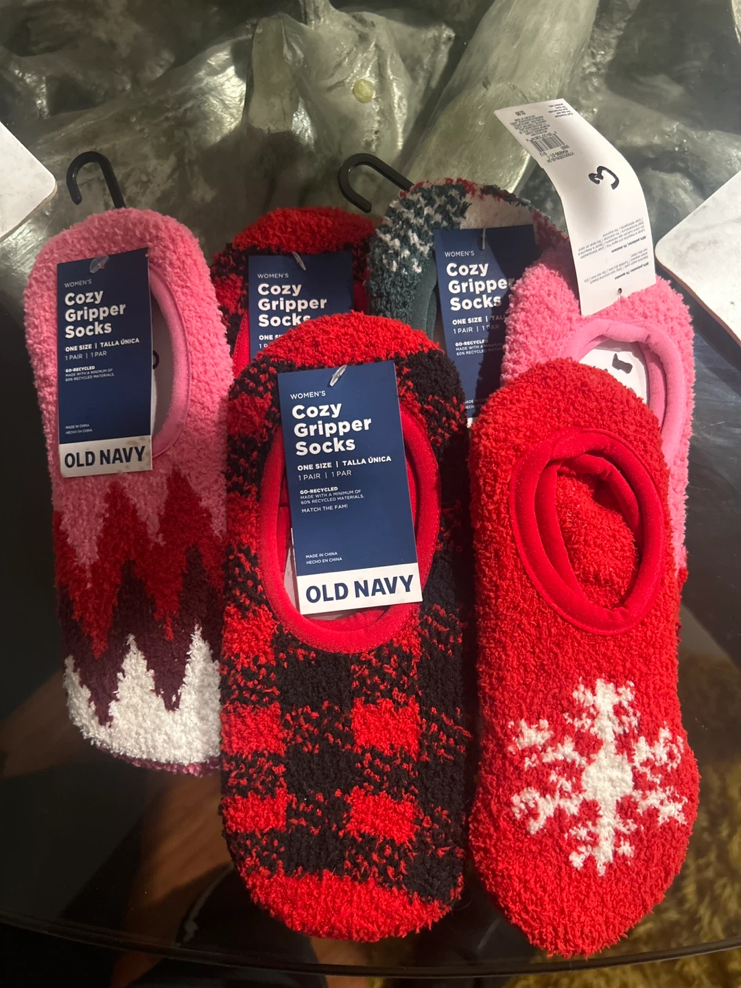 Selling a set of women's cozy gripper socks from Old Navy! These are one size and come in various cute patterns. Perfect for keeping your feet warm and cozy around the house. Socks have a floor grip. Sold in a single pair