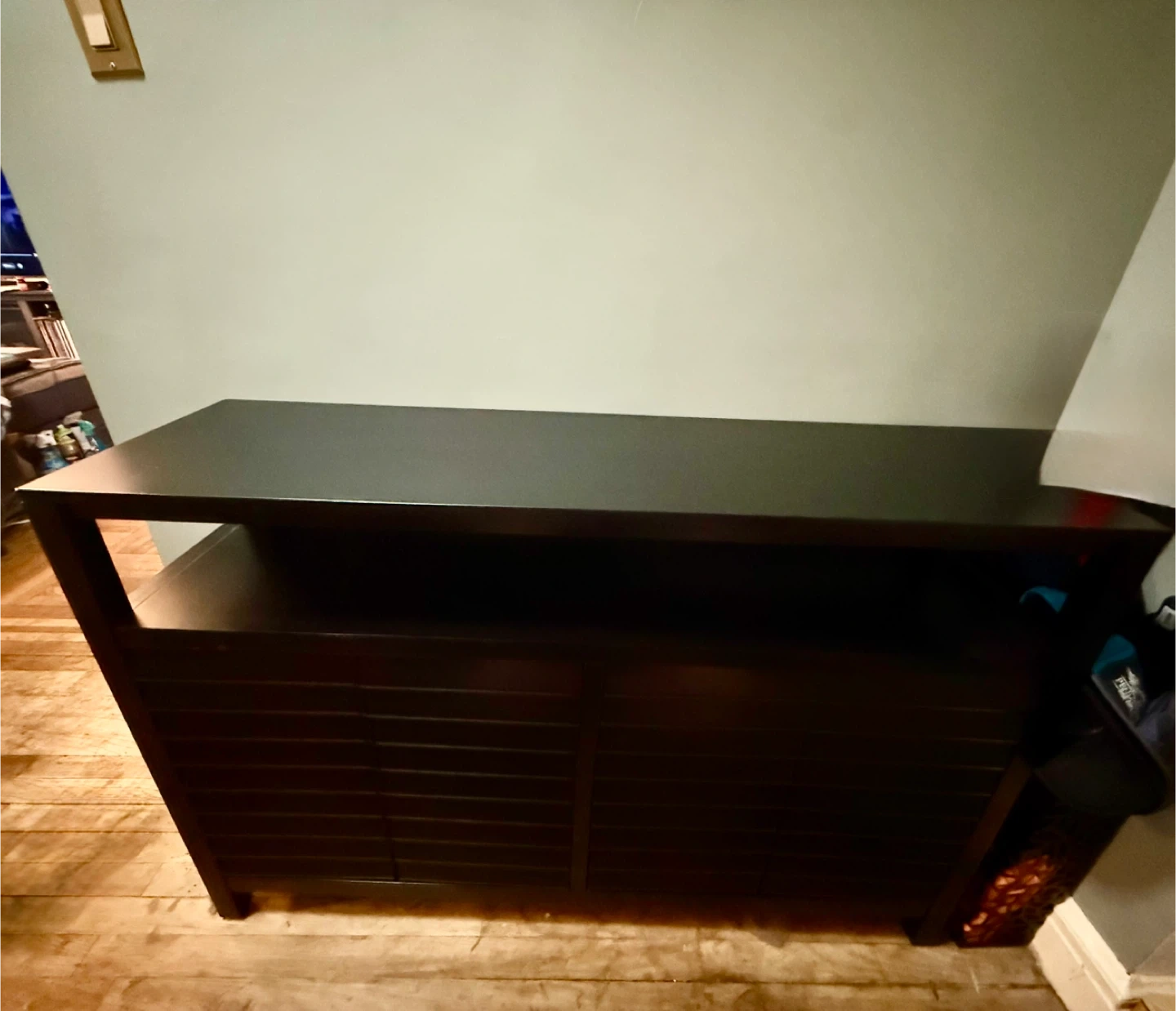 Black TV stand or Entryway Cabinet. It's in good condition less than a yr old and has plenty of storage space with push magnet doors and shelves within as well as open shelving under main top piece. H-32in L-48in D-14in Open to Negotiations