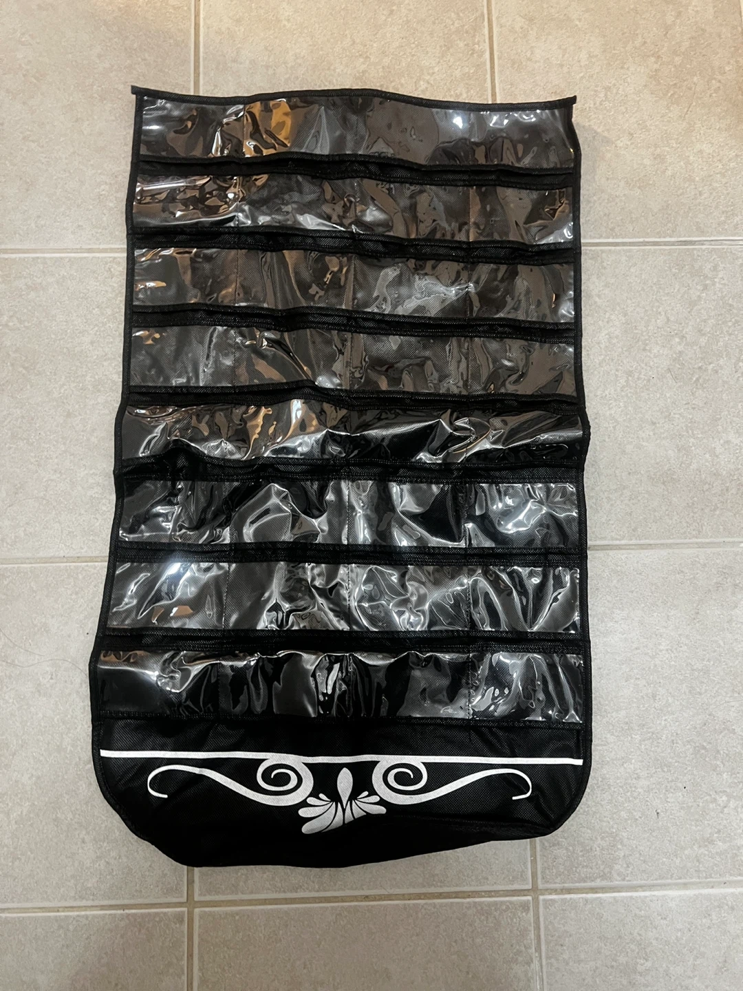 This black fabric hanging organizer has 80 clear vinyl pockets for storing jewelry or small accessories. It features a decorative white swirl design on the bottom. It's ideal for keeping items visible and easily accessible!