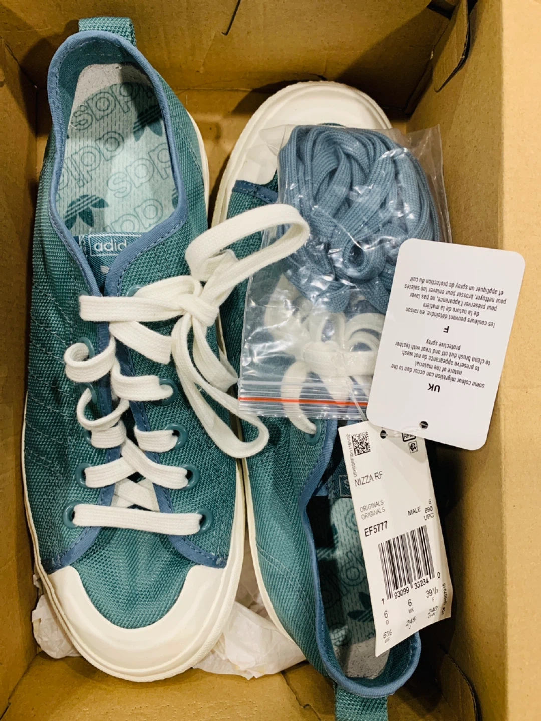 Selling a brand new pair of Adidas Nizza RF Originals shoes, model EF5777 in size 6! They come with the original box and an extra set of laces. The shoes are a stylish blue-green color, perfect for casual wear. These are male shoes, UPC 193099 332340