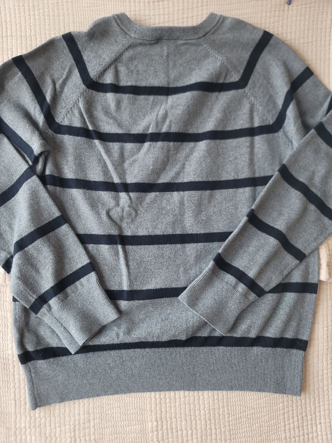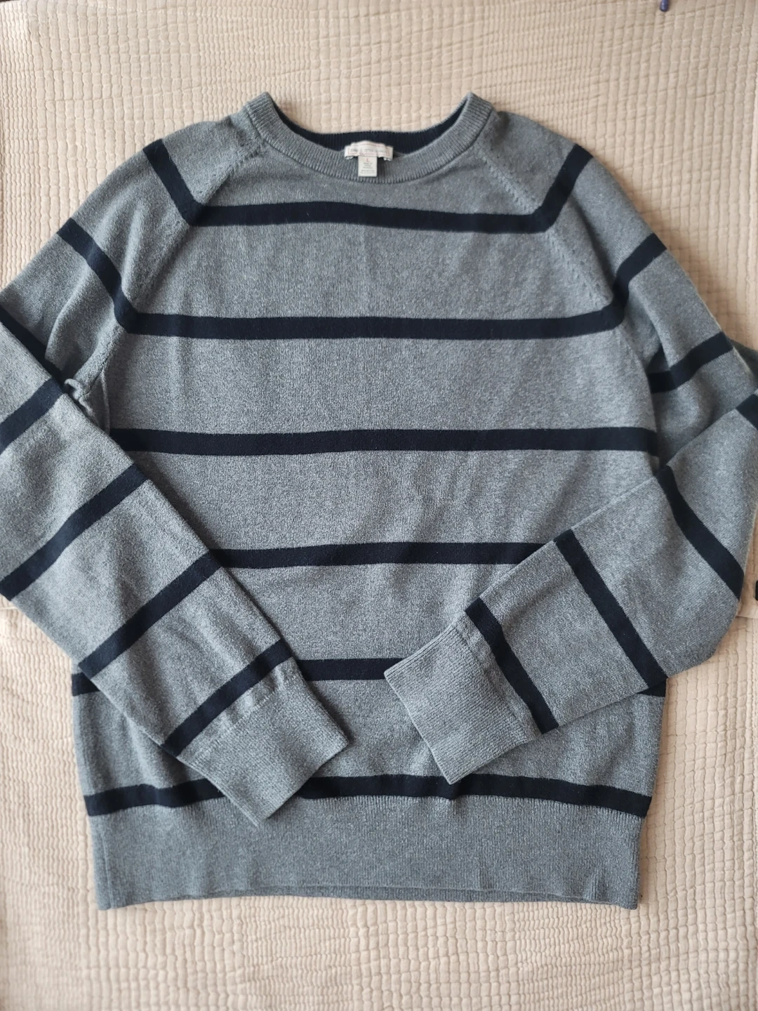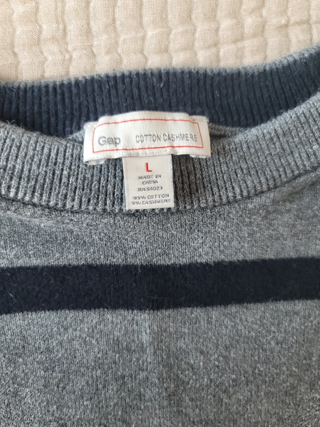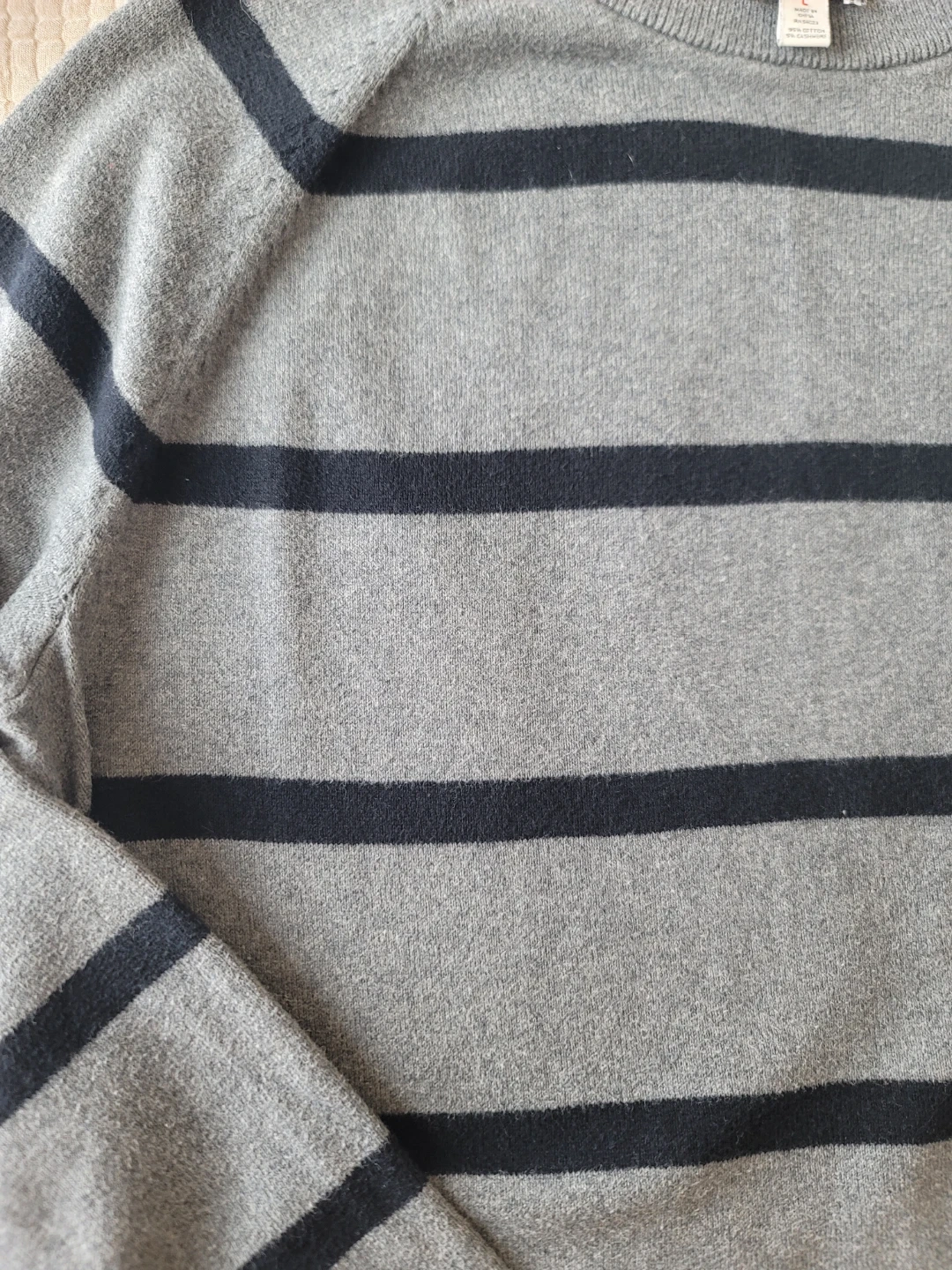 Selling a Gap sweater in size large. It's a gray striped sweater made from cotton and cashmere. Perfect for staying cozy!