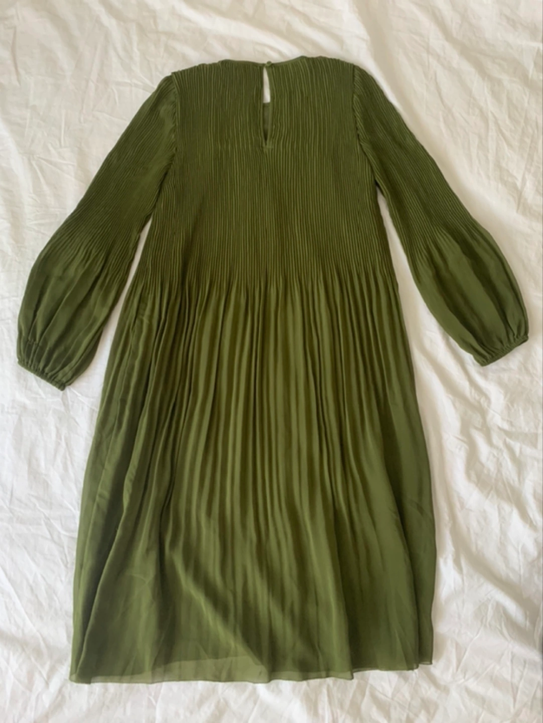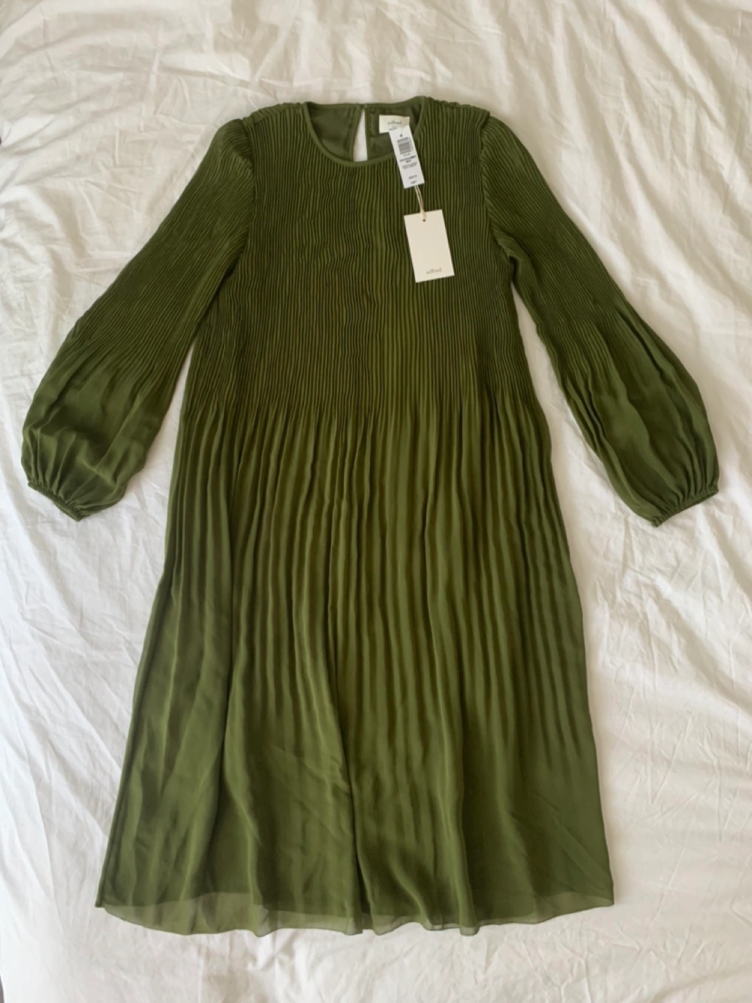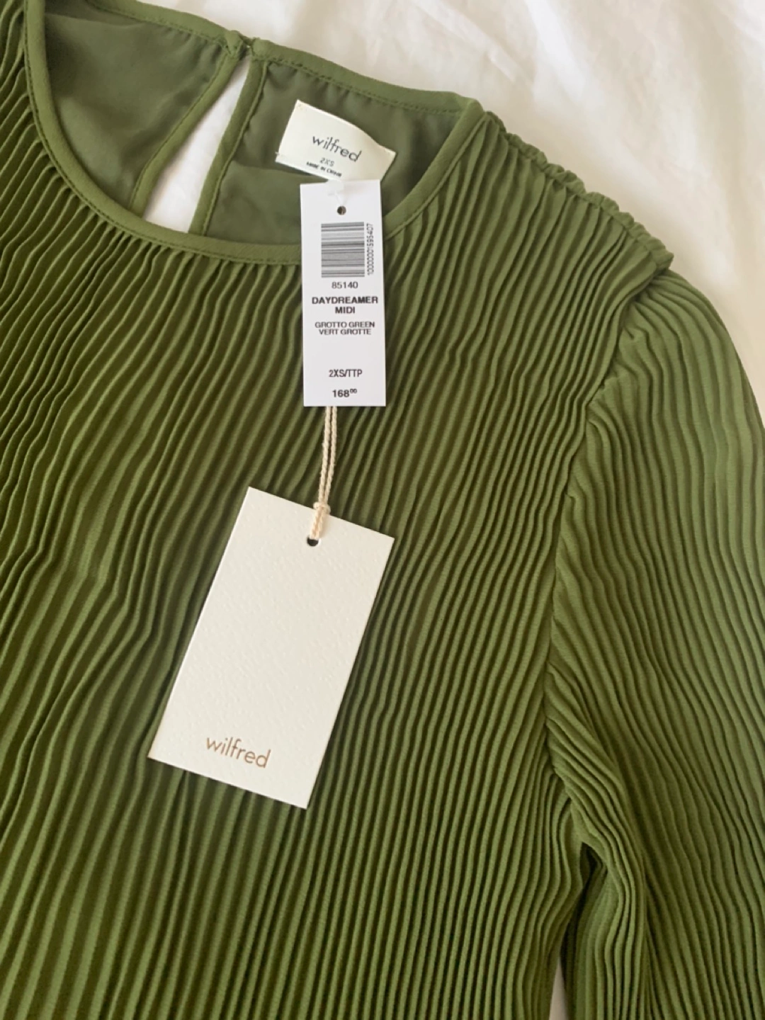 Olive green pleated midi dress. Size xxs but oversized fits xs/s (size 0/2) which is my actual size. Brand New with tags! Bought as an option for a wedding. I have several in other colors, the drape of the flowy and airy fabric feels elegant and very comfortable. Originally $190 with tax. Pick up near Spadina Ave & Front St W Cash only please!