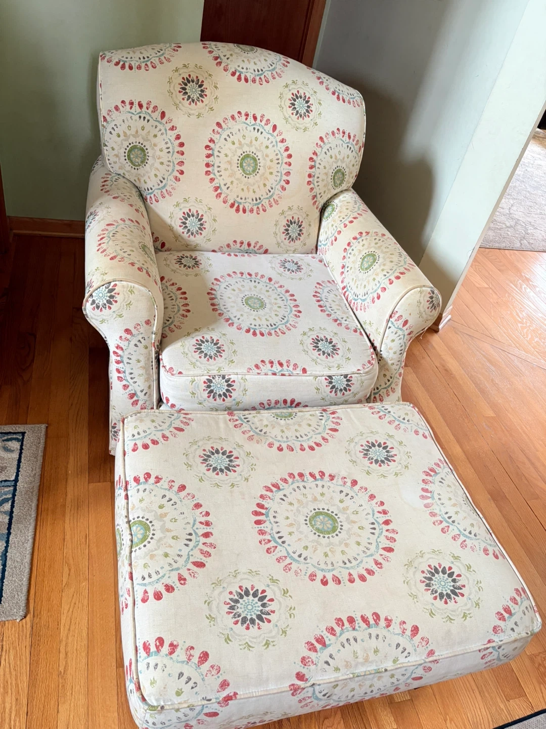 Cream colored accent chair with matching ottoman. Features a decorative medallion pattern in shades of red, green, and gray. Upholstered in a durable fabric. Perfect for a reading nook or living room.