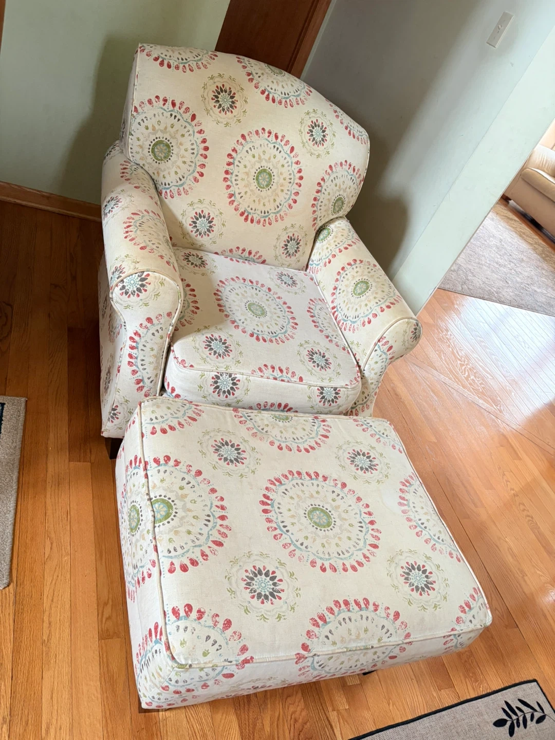 Cream colored accent chair with matching ottoman. Features a decorative medallion pattern in shades of red, green, and gray. Upholstered in a durable fabric. Perfect for a reading nook or living room.