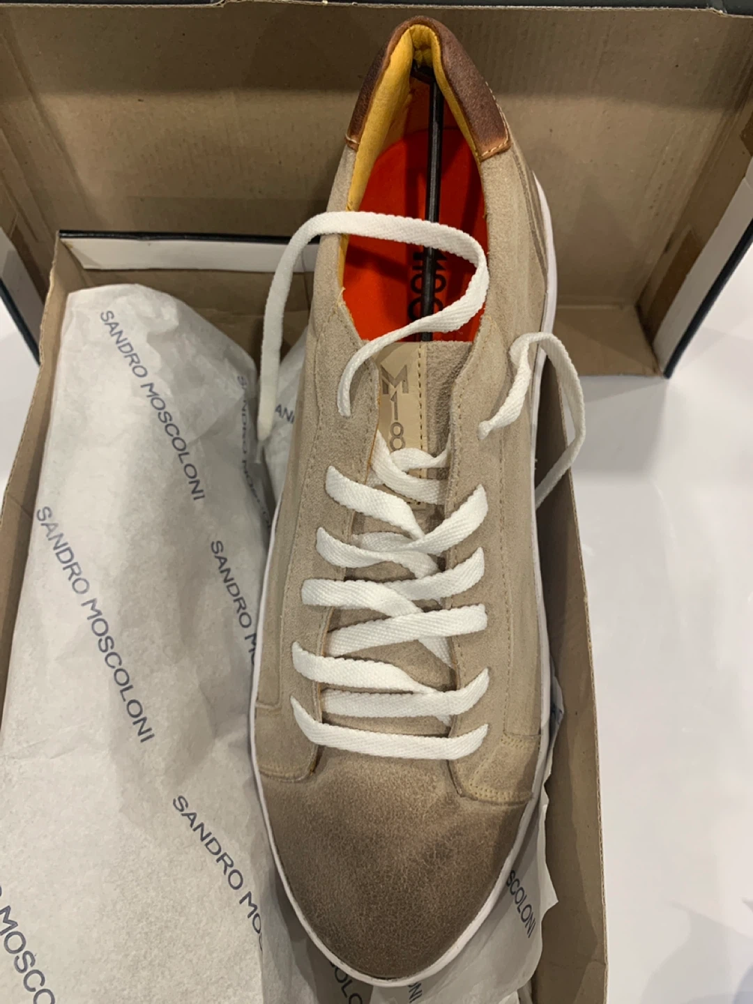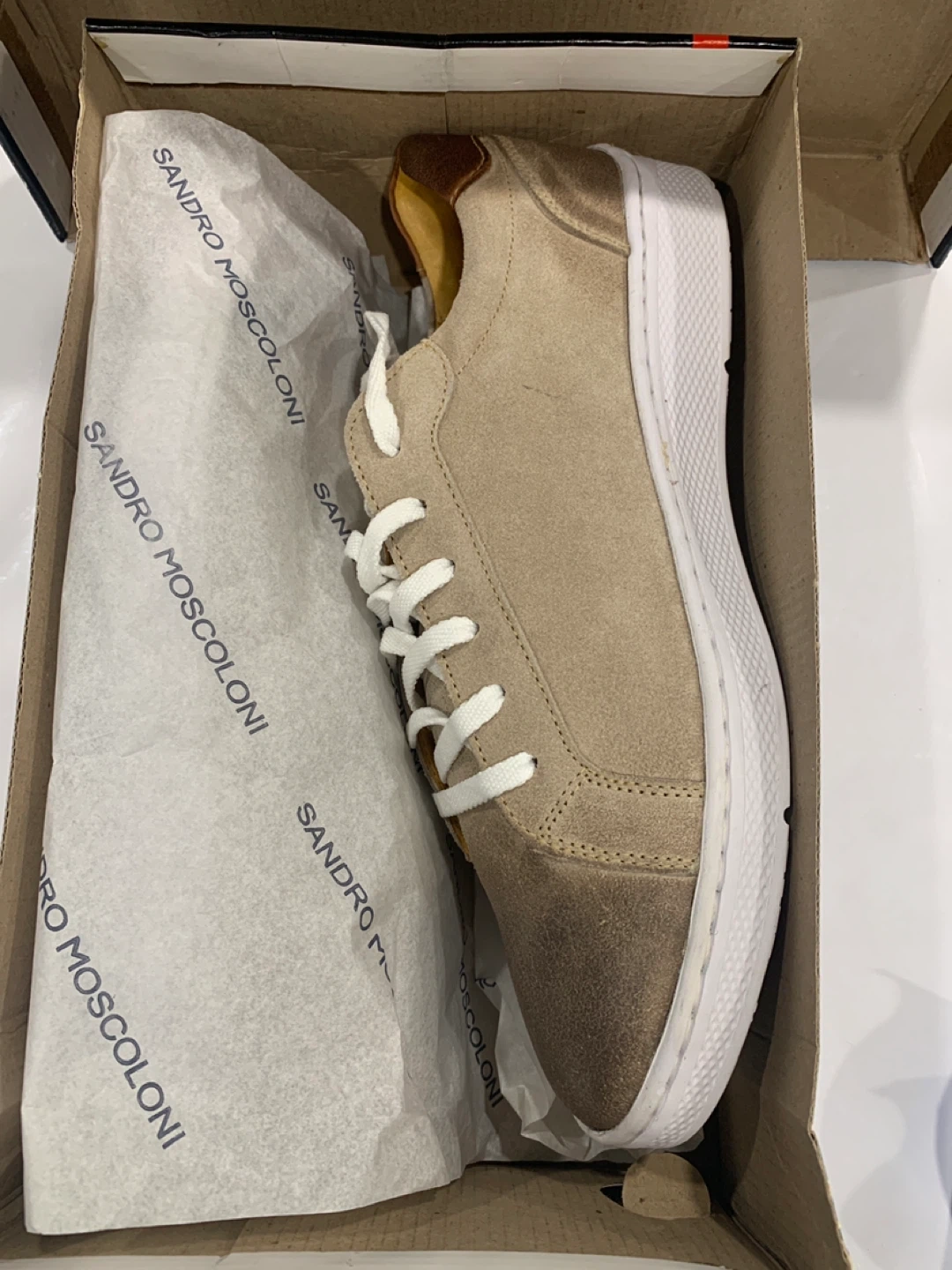 Sandro Moscoloni "Hillon" sneakers in beige suede. These casual shoes feature white laces and a white sole. They come in their original box.
