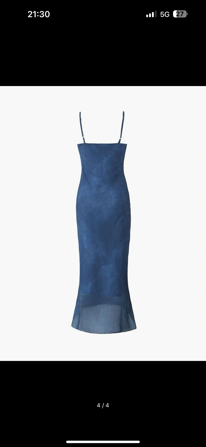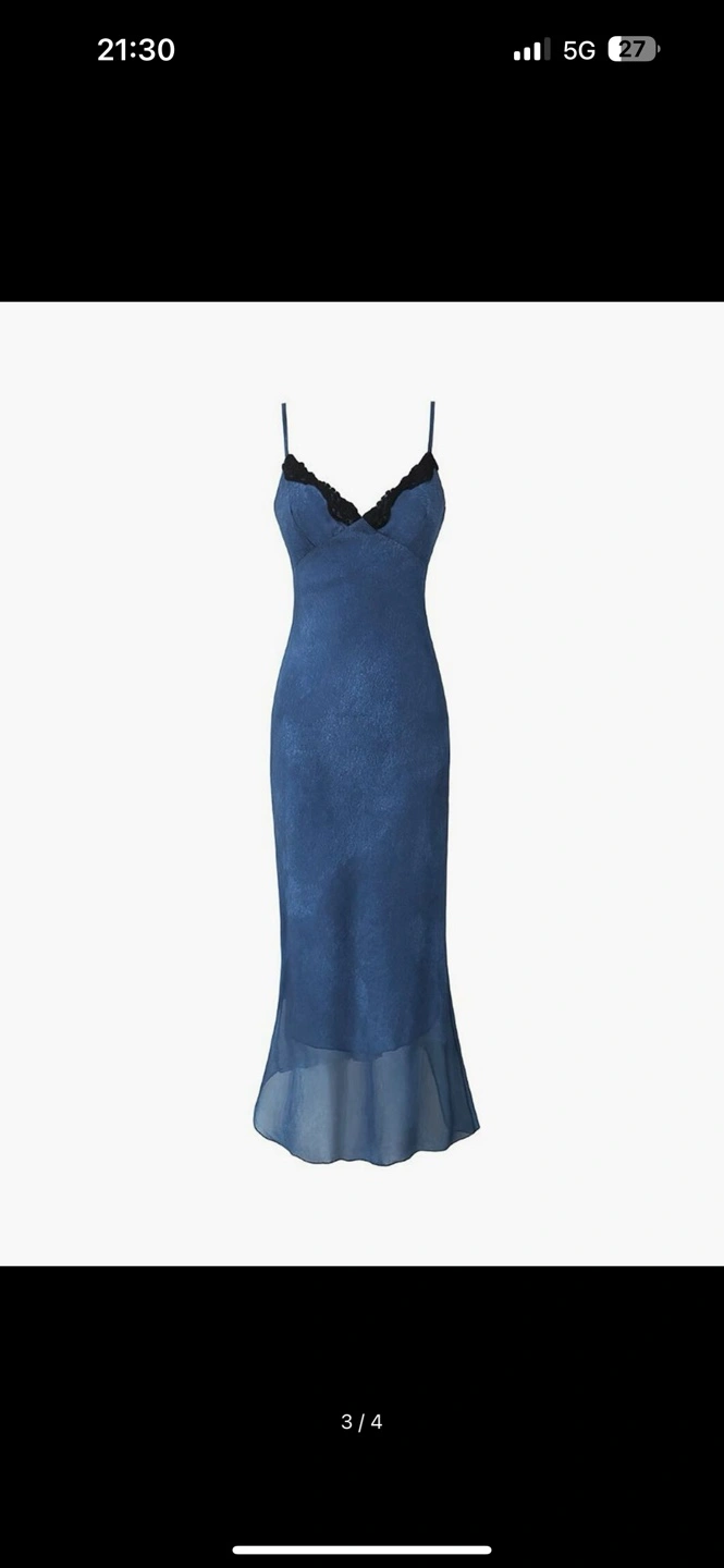 Beautiful midi slip dress. Features delicate lace trim and a flowy silhouette. Perfect for a night out or special occasion. Blue color.