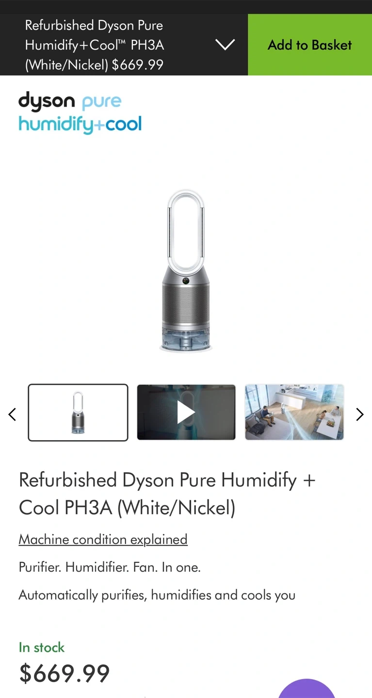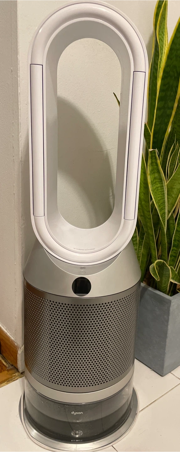 This Dyson Pure Humidify + Cool combines purification, humidification, and cooling. It automatically purifies, humidifies, and cools your space. The unit's color is white and nickel.