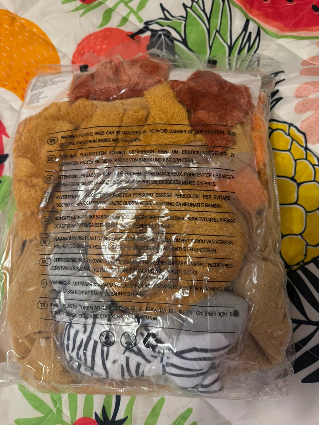 This adorable lion costume includes a lion jumpsuit, a lion hat, and a pair of lion booties. It also comes with a plush toy zebra. Perfect for Halloween or dress-up parties!