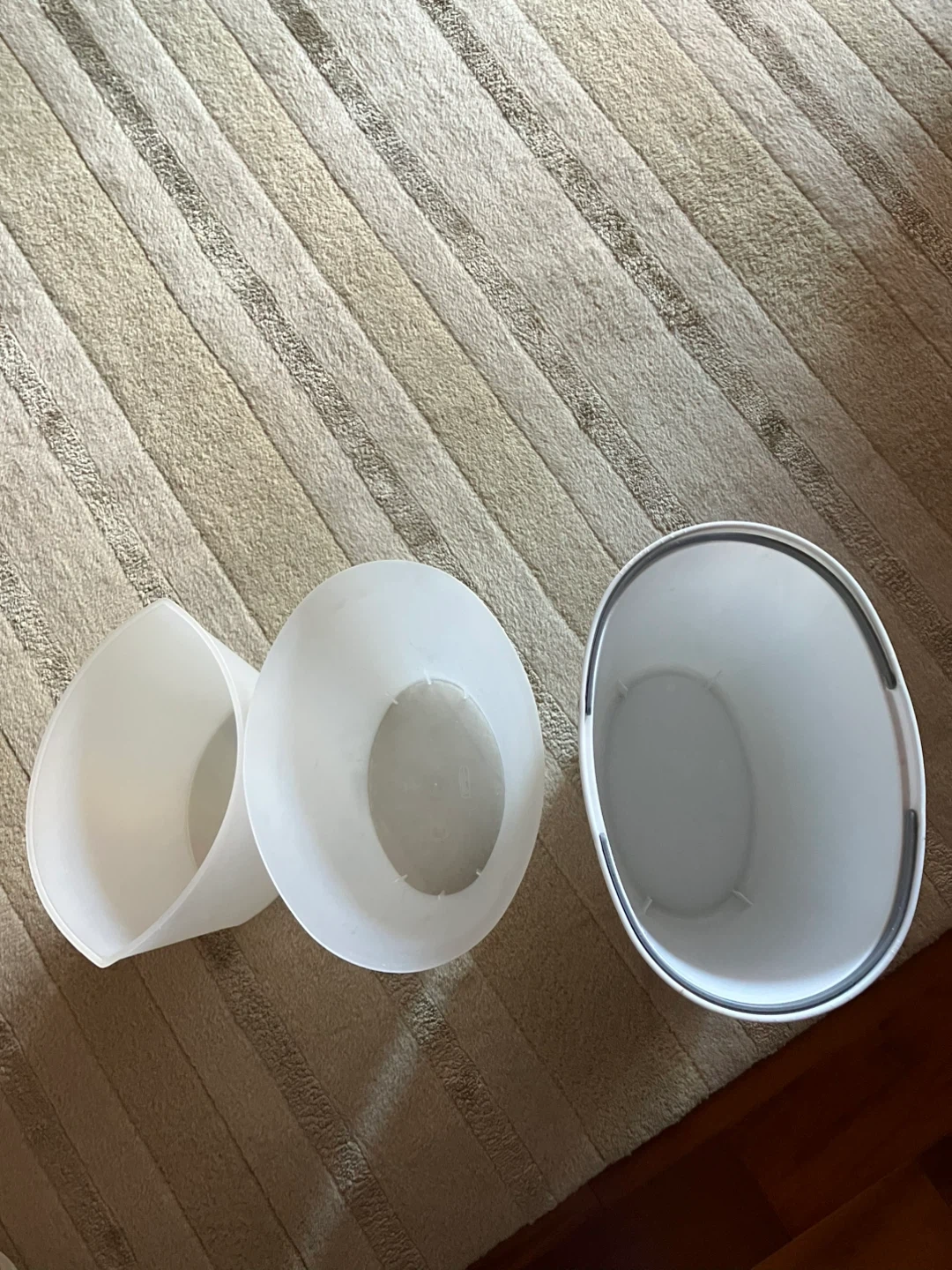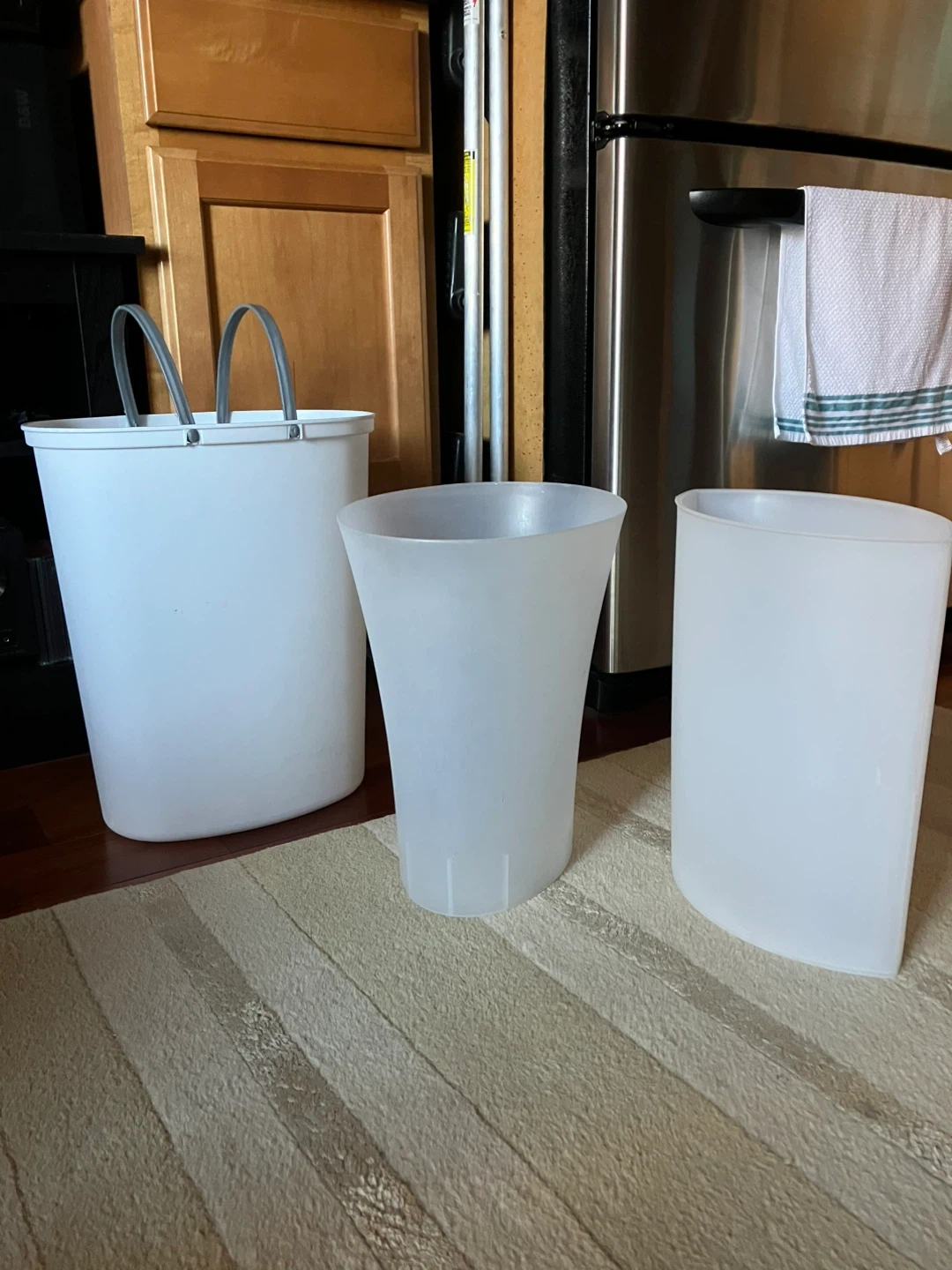 Three white plastic waste baskets in various sizes. One trash can has a handle. Great for any room in the house! One under cabinet garbage can with handles and 2 smaller waste baskets. Cash and pick up only.