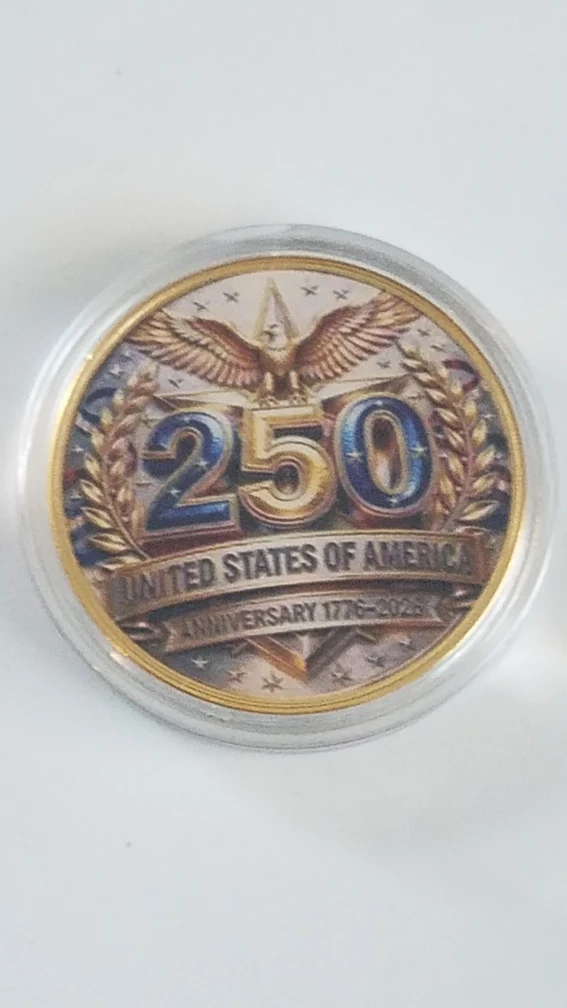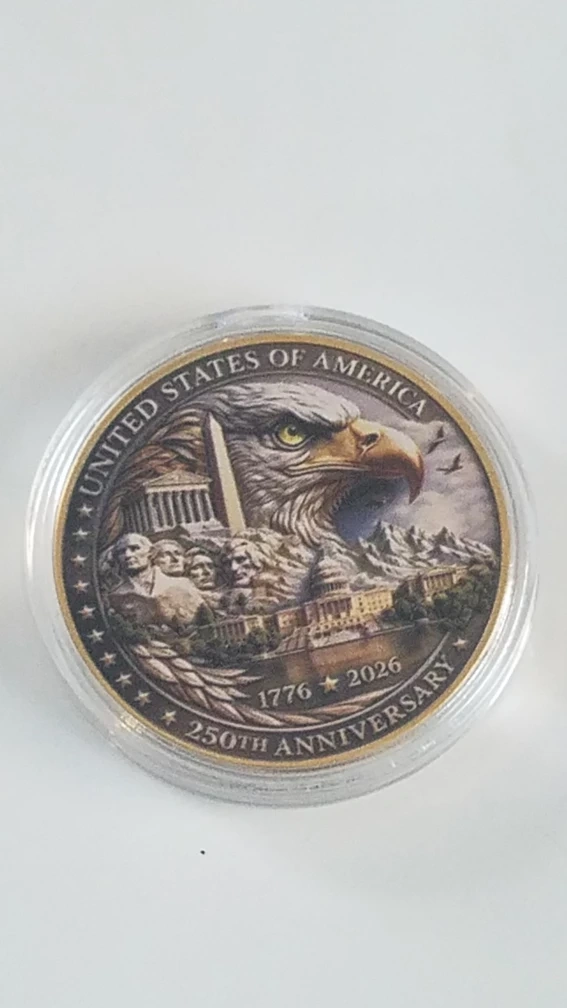 Commemorative coin celebrating the 250th Anniversary of the United States of America, from 1776-2026. Features patriotic imagery including an eagle, Mount Rushmore, and the Capitol building. Encased in a protective plastic holder brand new 12 available $10 each