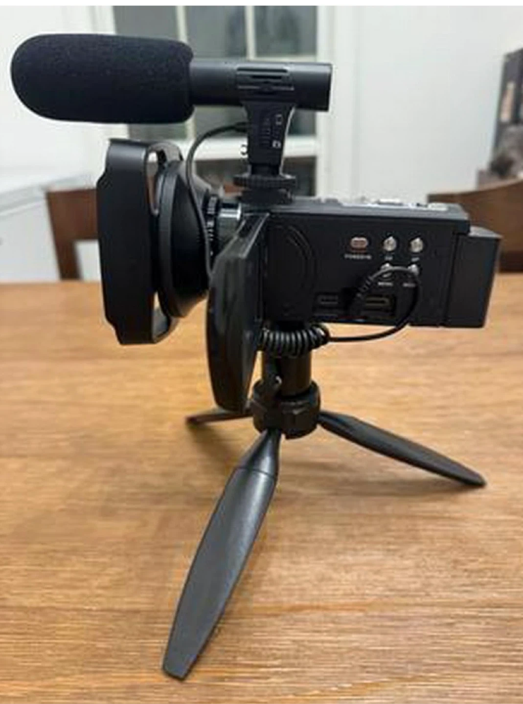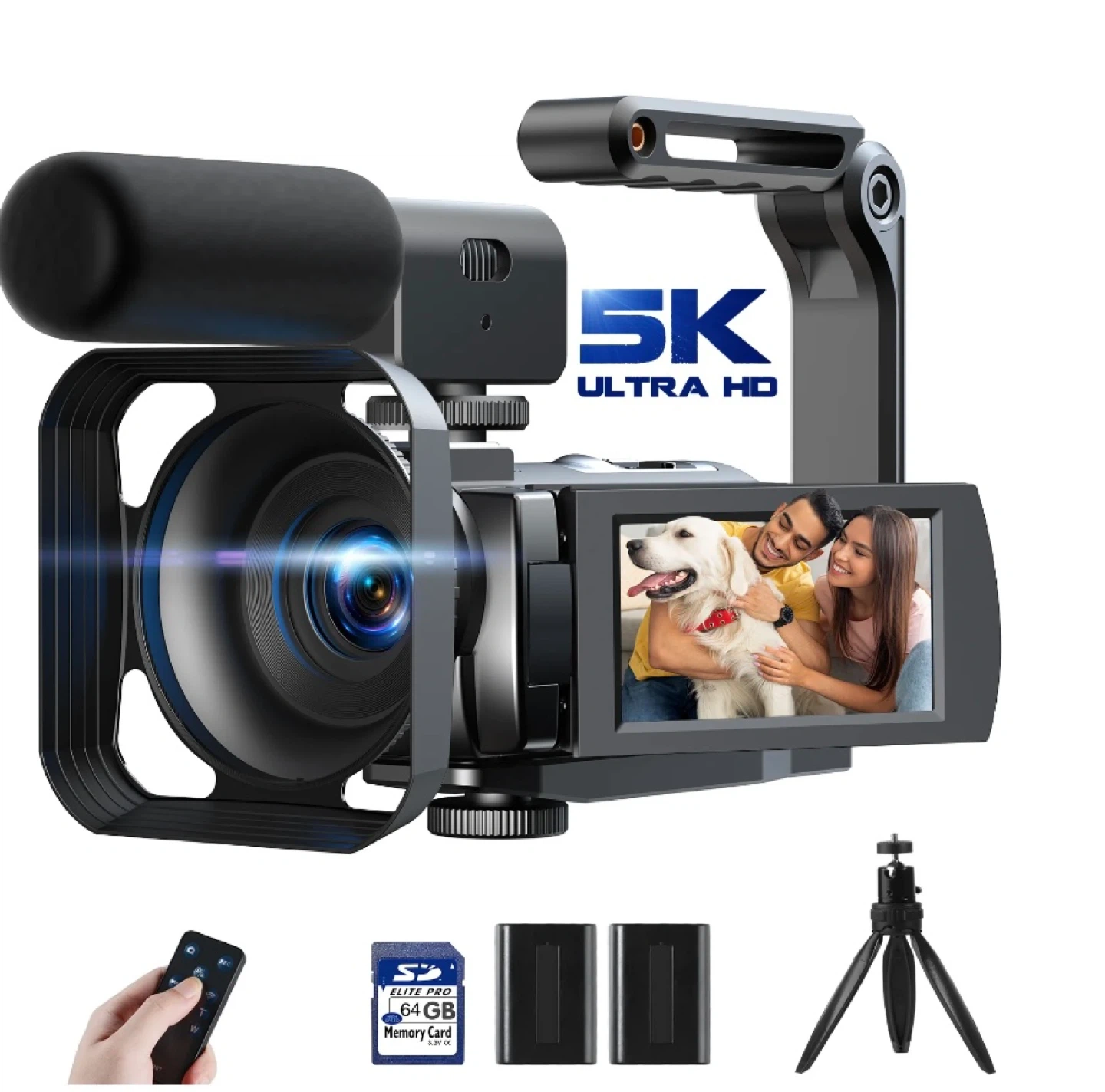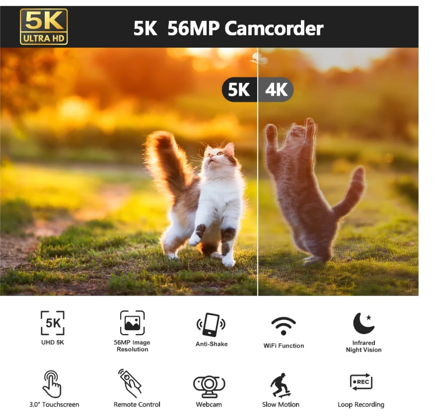 In original Box Selling a 5K Ultra HD camcorder. It features 56MP image resolution, anti-shake, WiFi function, and infrared night vision. It also has a 3.0" touchscreen, remote control, and webcam function. It supports slow motion and loop recording. Included are a remote, 64GB memory card, two batteries, and a tripod