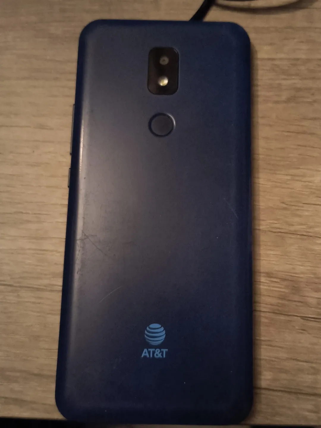 This is a blue AT&T smartphone. It has a rear camera and a fingerprint sensor. It's ready for a new owner!