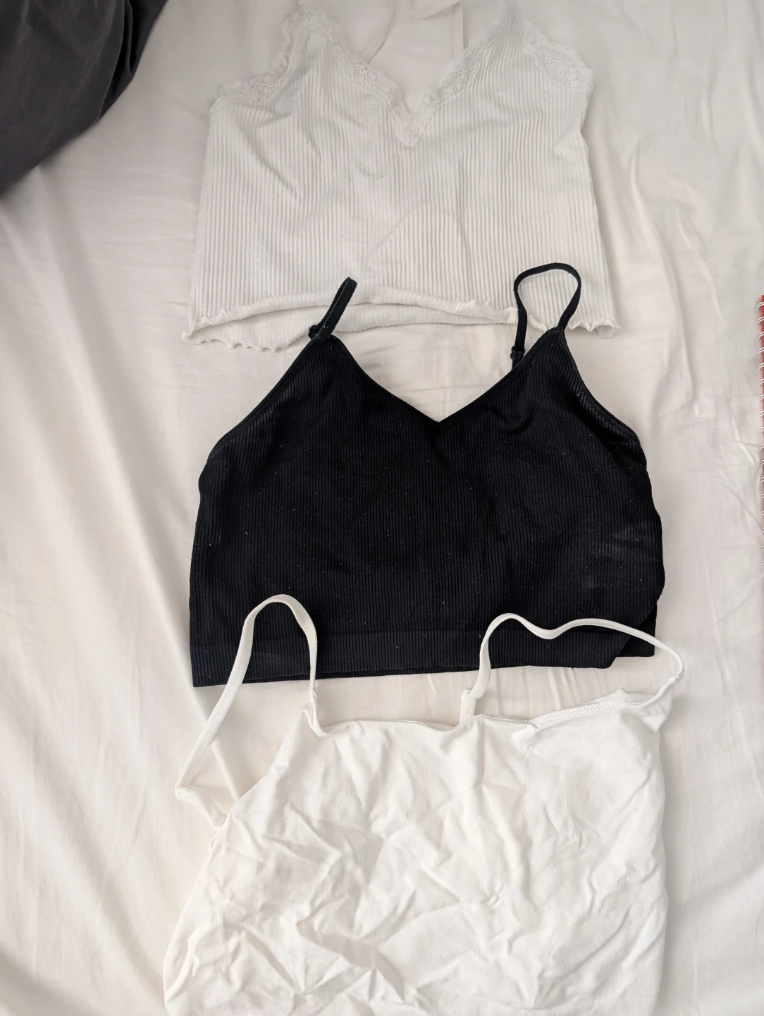 Comes with ribbed camisoles, one black and one white. Both are made from a comfortable, stretchy material. They're great for layering or wearing on their own!