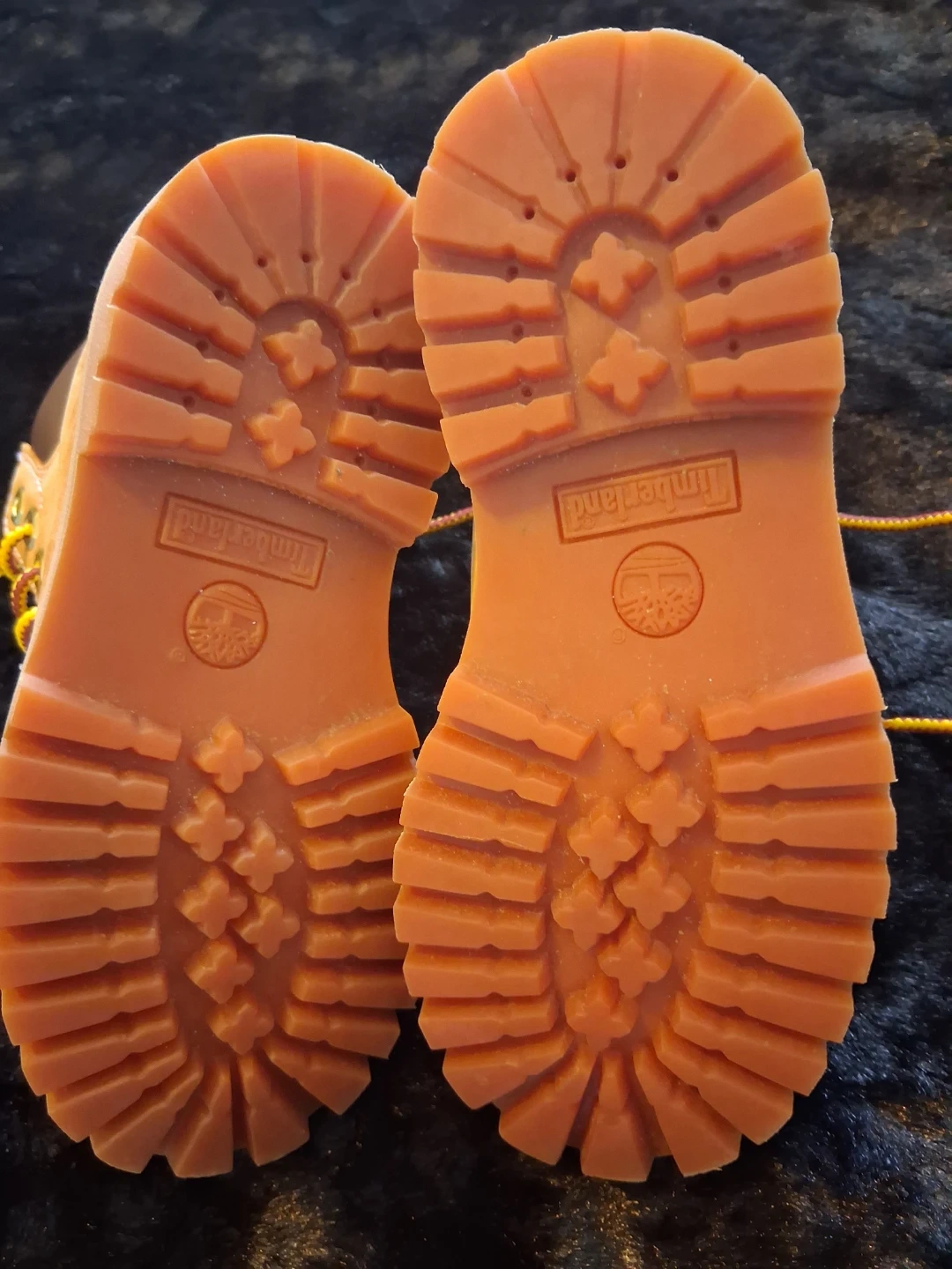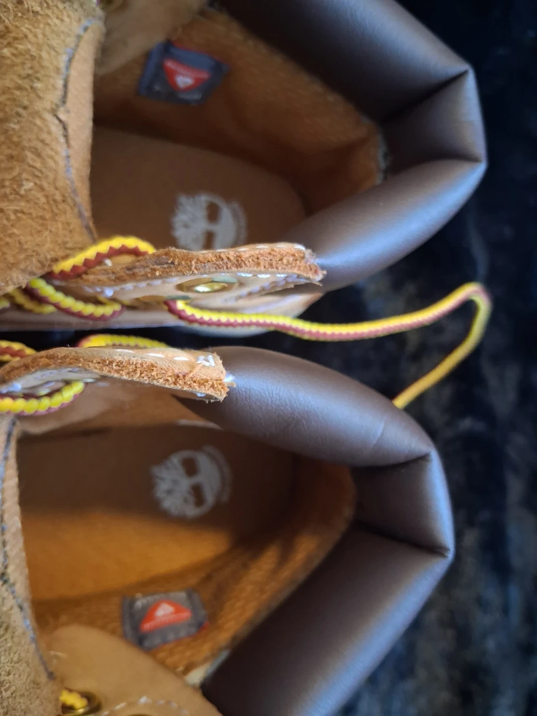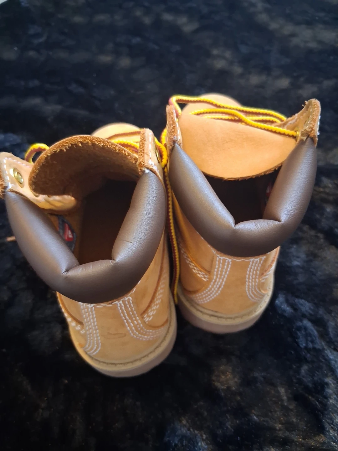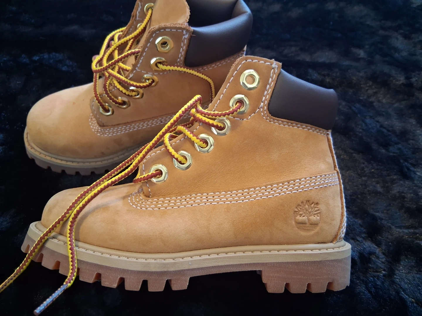 These are Timberland kids boots. They're tan suede with yellow and red laces. Rubber sole for durability. Us 9 para nin̈o