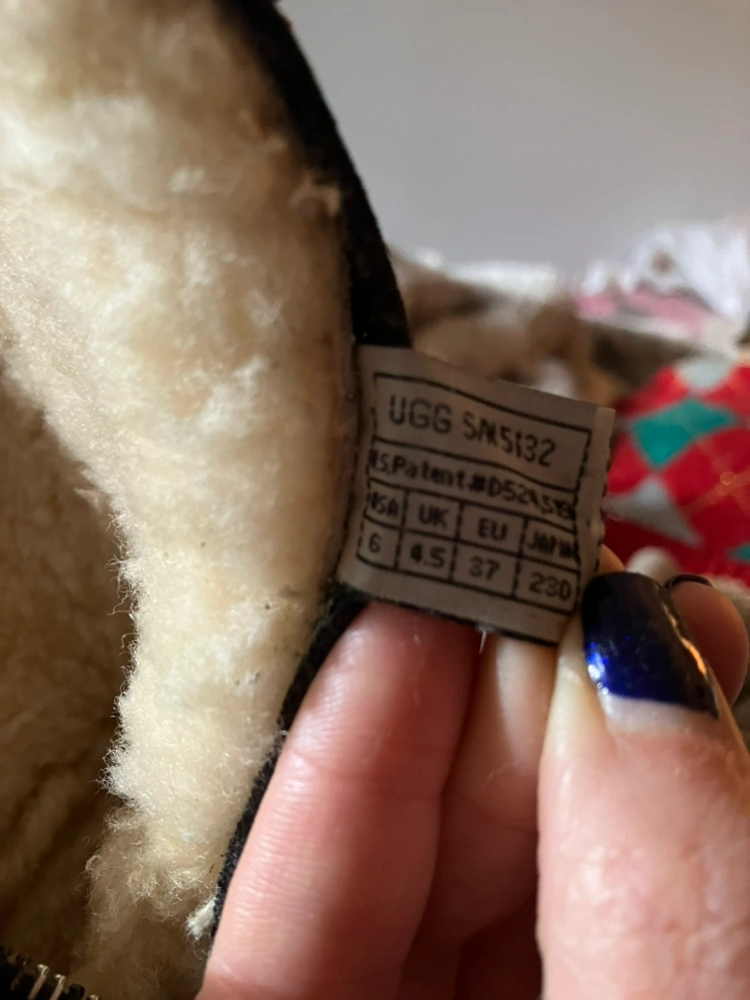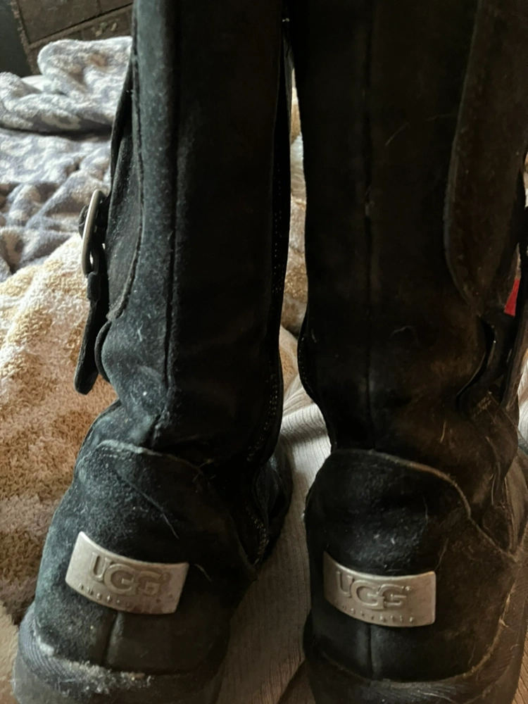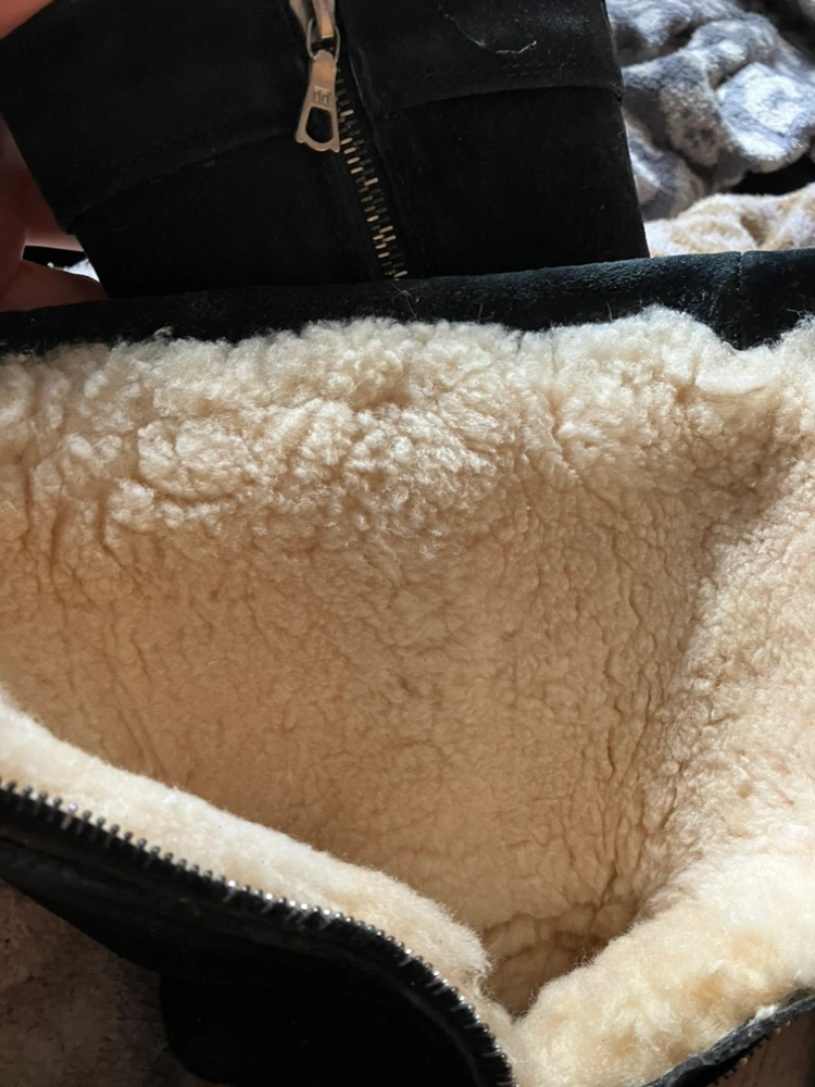 Beautiful and classic black suede, shearling lined and zip. Full length inside zip closure. Perfect for the season. Authentic UGG. Hope they keep you warm :) PU in Kits, may be able to deliver no charge within the area….