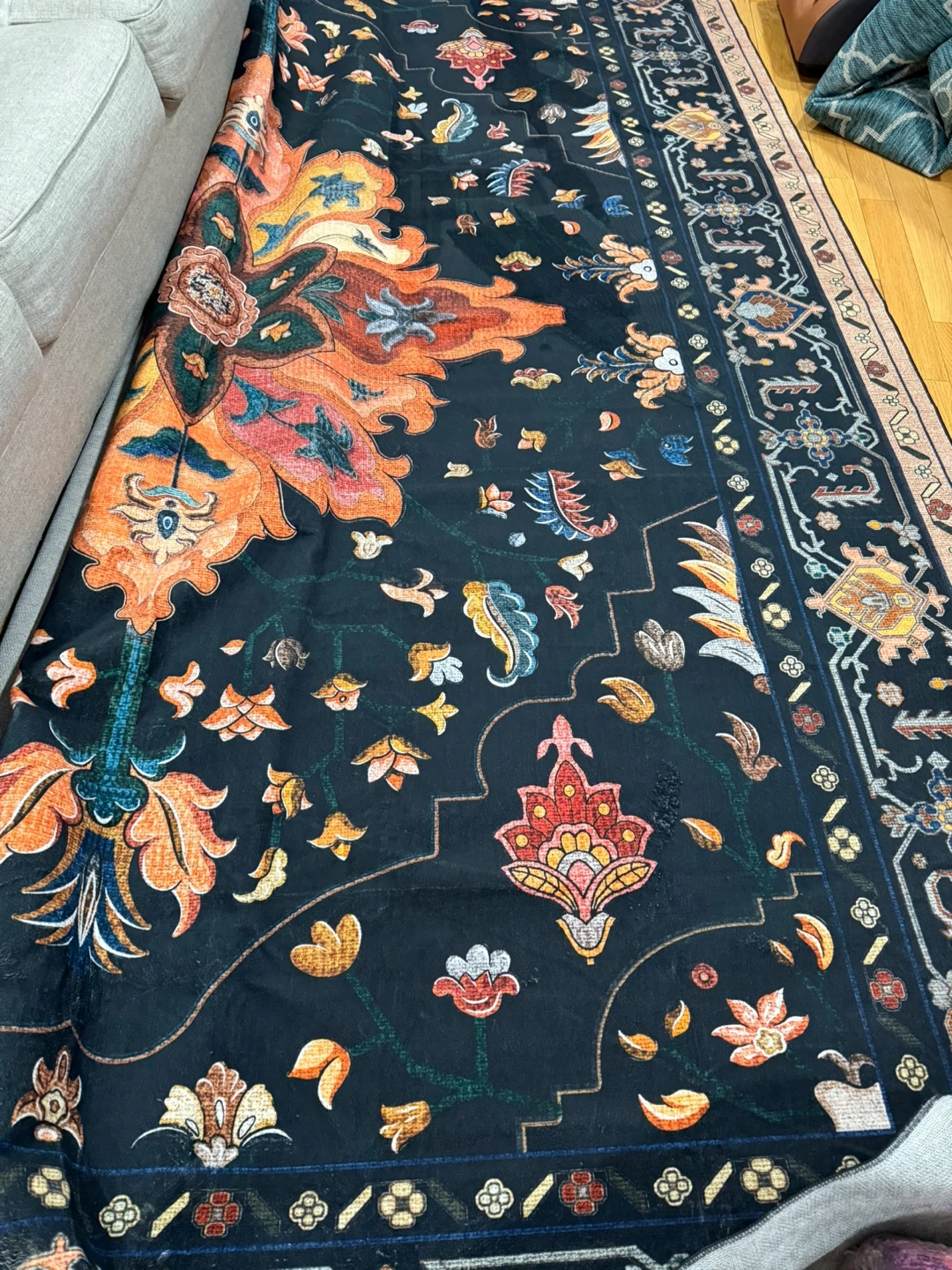 This washable area rug features a vintage floral medallion print. It's designed with a soft surface, reinforced edge, and non-slip backing for safety. The pile height is 0.2 inches. 9x12 Apparently new