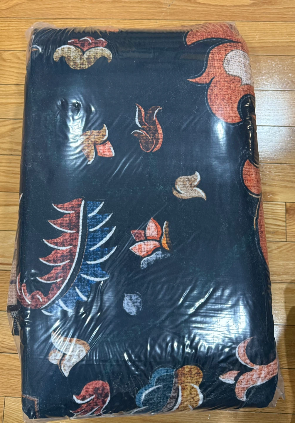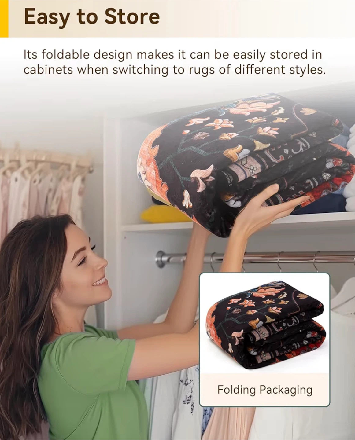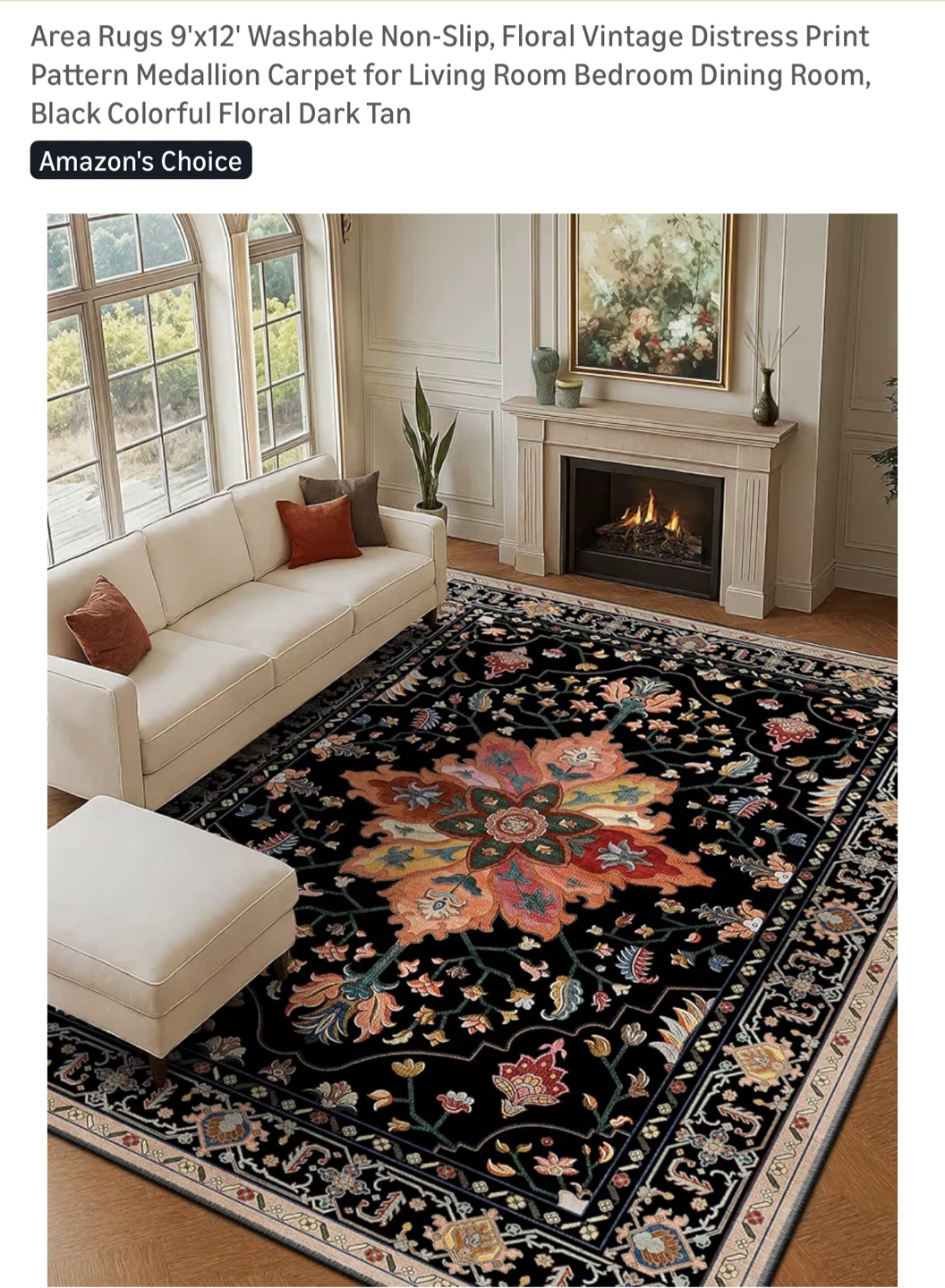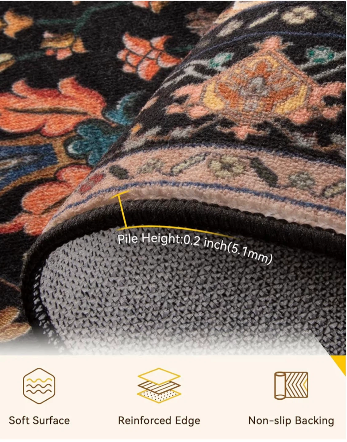 This washable area rug features a vintage floral medallion print. It's designed with a soft surface, reinforced edge, and non-slip backing for safety. The pile height is 0.2 inches. 9x12 Apparently new