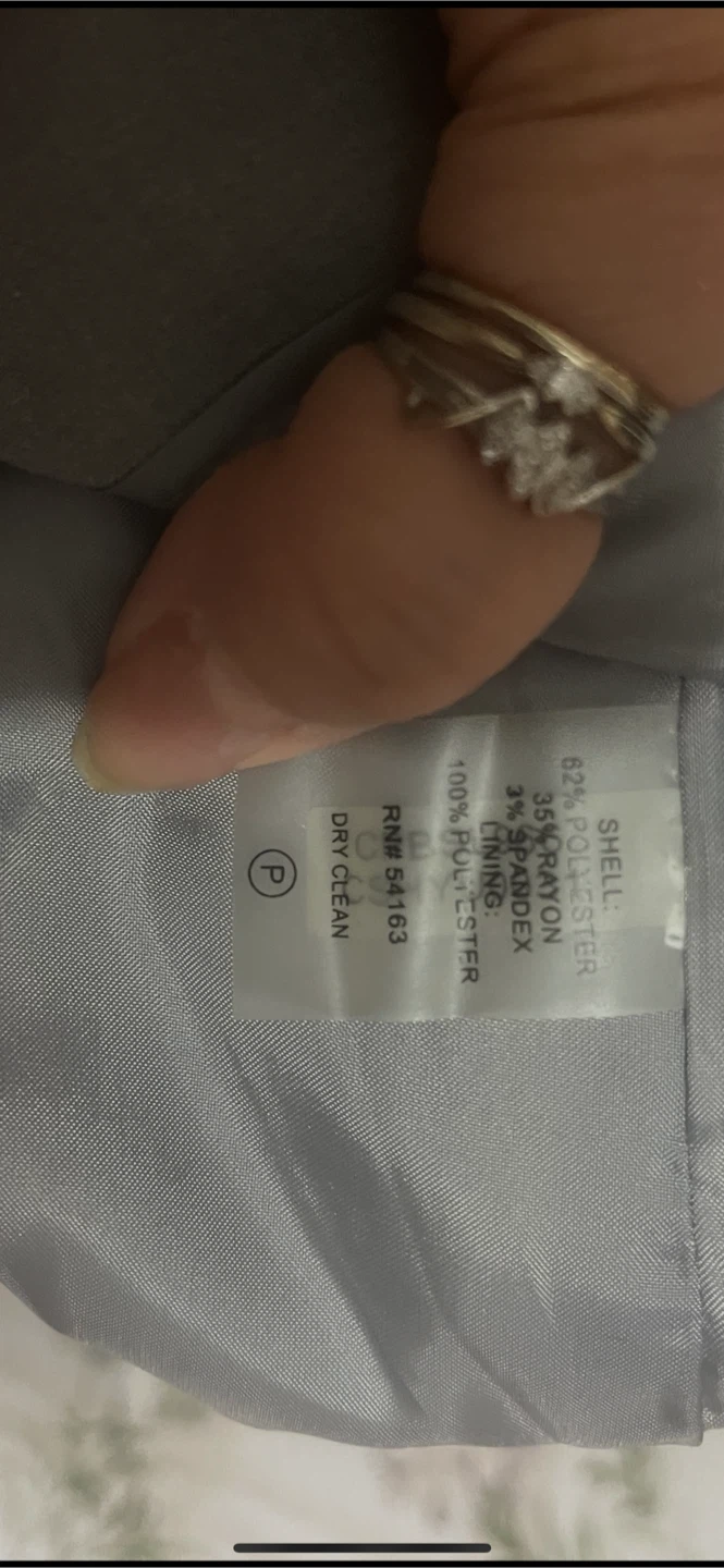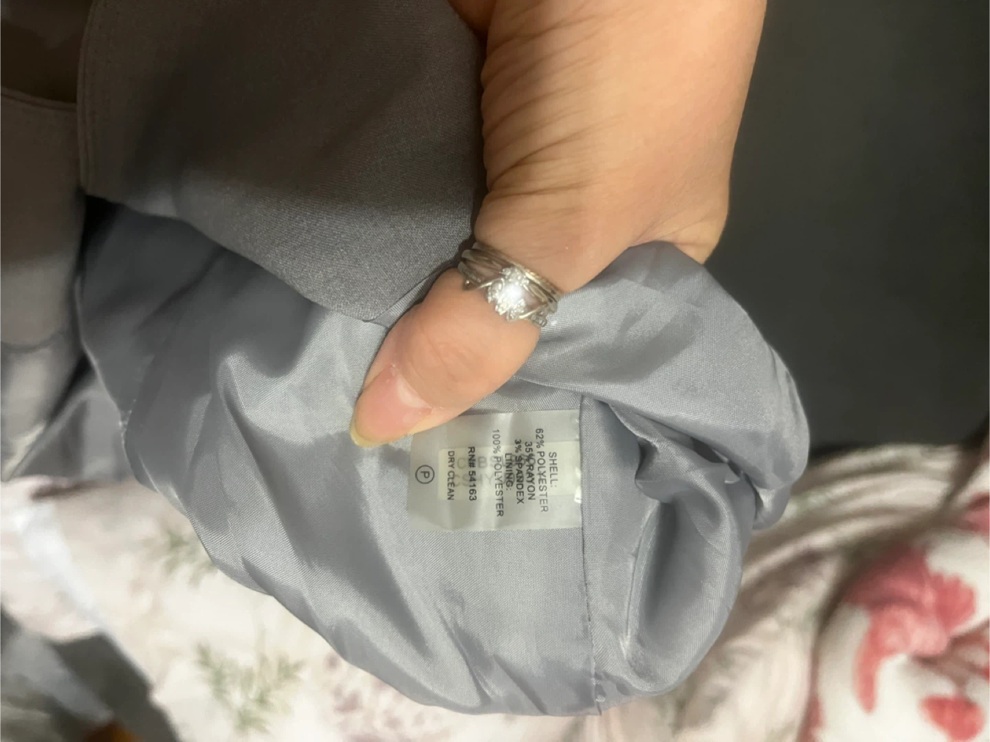 The outer shell is 63% polyester, 33% rayon, and 4% spandex, while the lining is 100% acetate