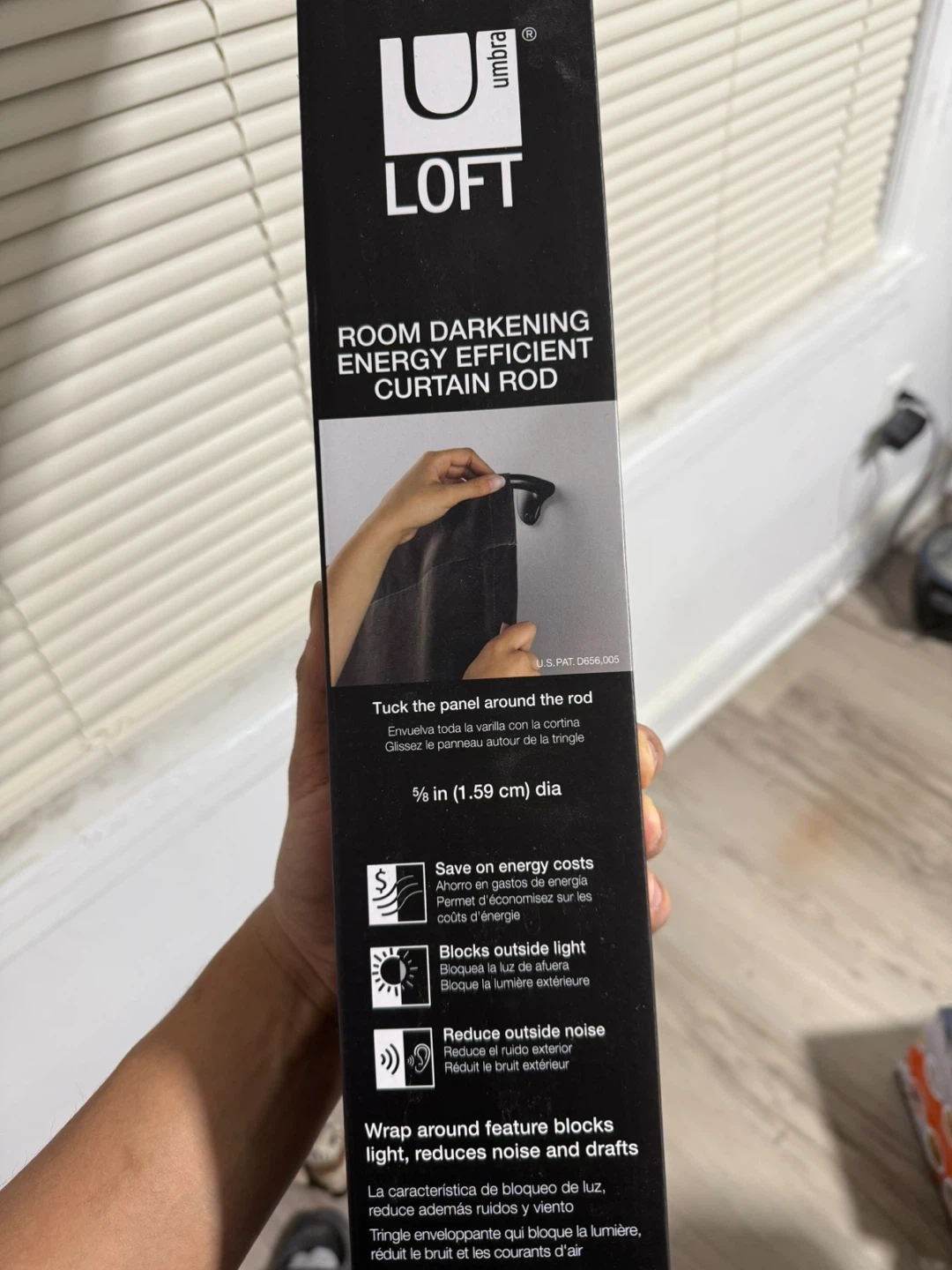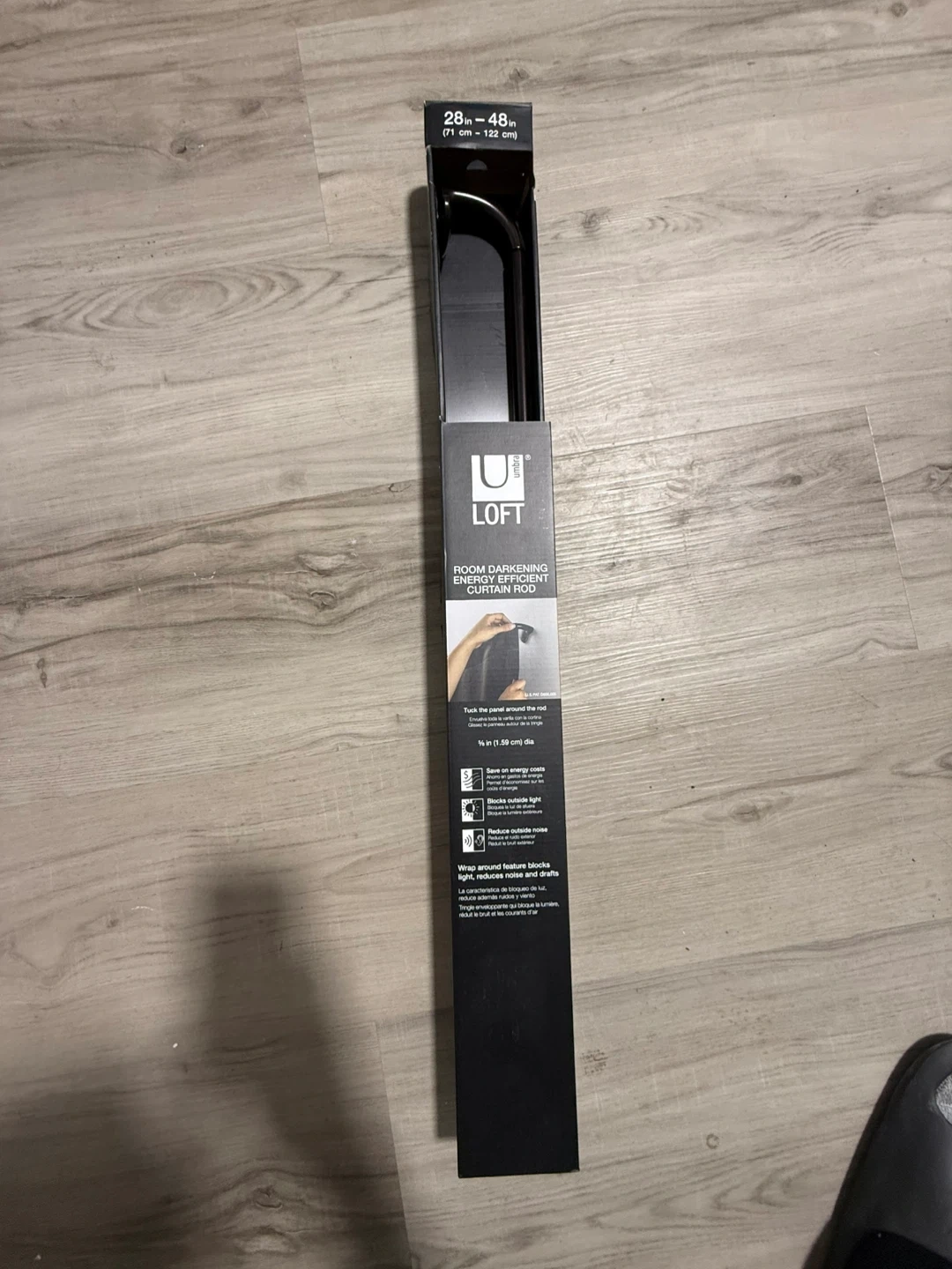 This Umbra Loft curtain rod is room darkening and energy efficient. It measures 28-48 inches (71-122 cm) and has a diameter of 5/8 inch (1.59 cm). It's designed to save on energy costs, block outside light, and reduce noise.