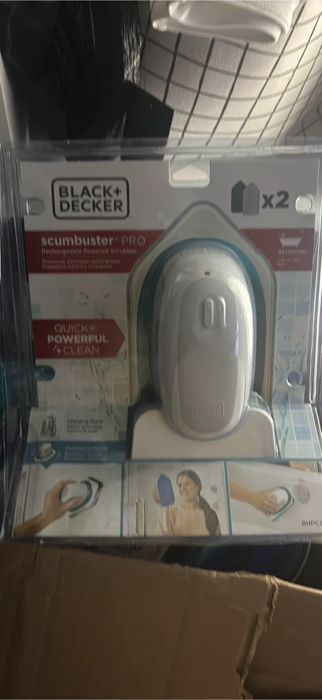 This Black+Decker Scumbuster Pro is a rechargeable powered scrubber designed for quick and powerful cleaning. It features oscillating motion and includes a charging stand. Lithium-ion rechargeable power.