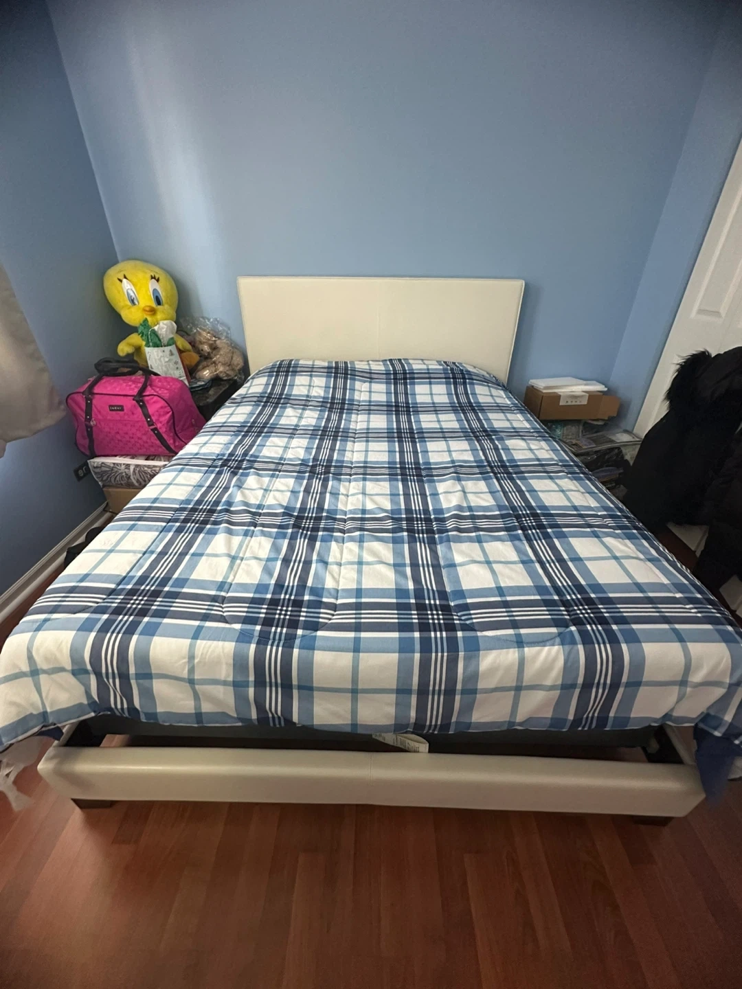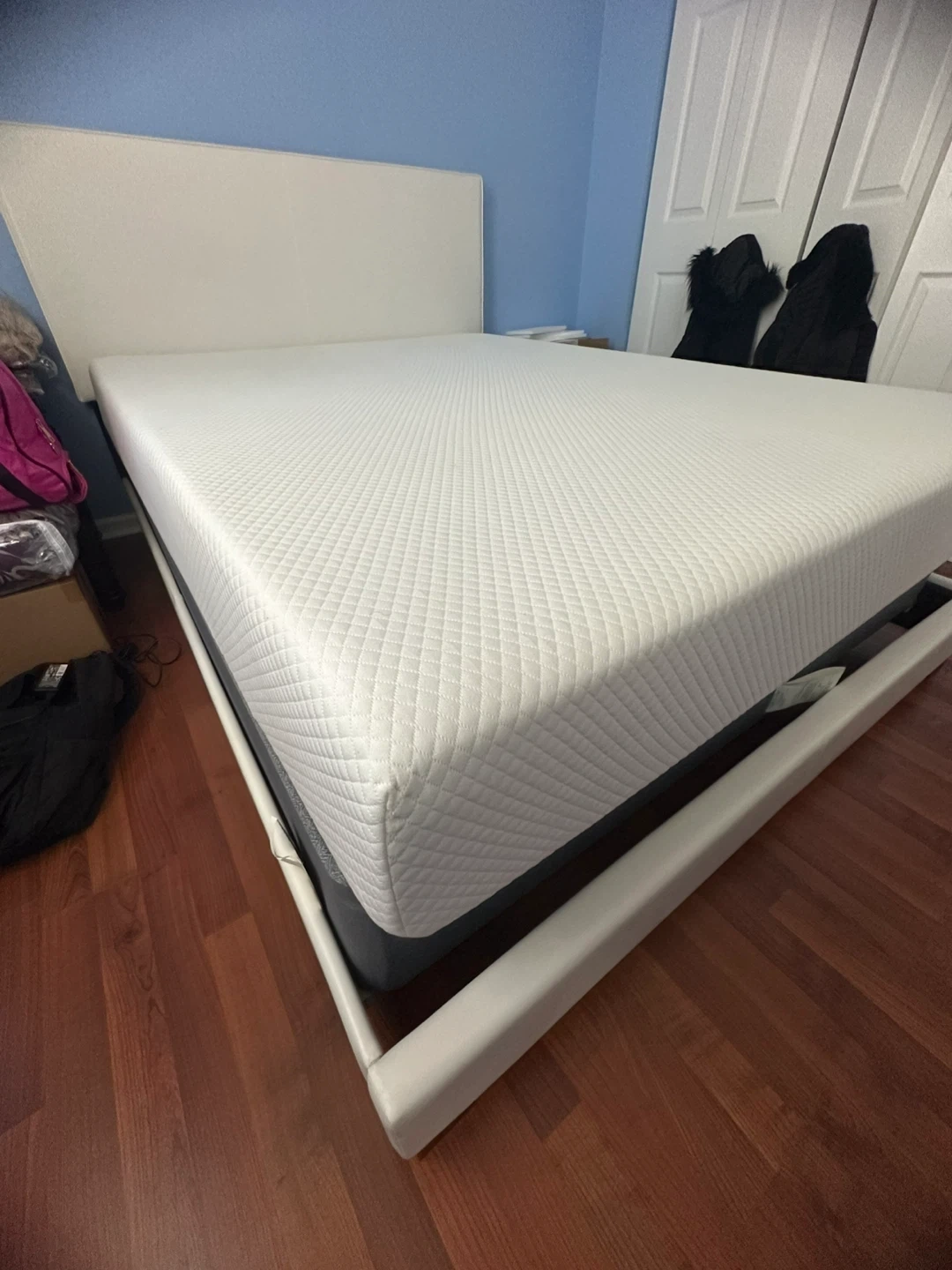 White upholstered Queen bed frame with a matching headboard. Includes a white temperpedic mattress. This bed set's clean lines make it a versatile addition to any bedroom. It's ready for a new home!