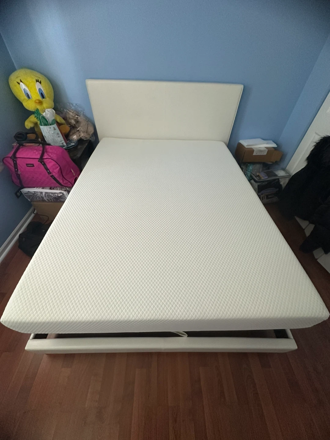 White upholstered Queen bed frame with a matching headboard. Includes a white temperpedic mattress. This bed set's clean lines make it a versatile addition to any bedroom. It's ready for a new home!