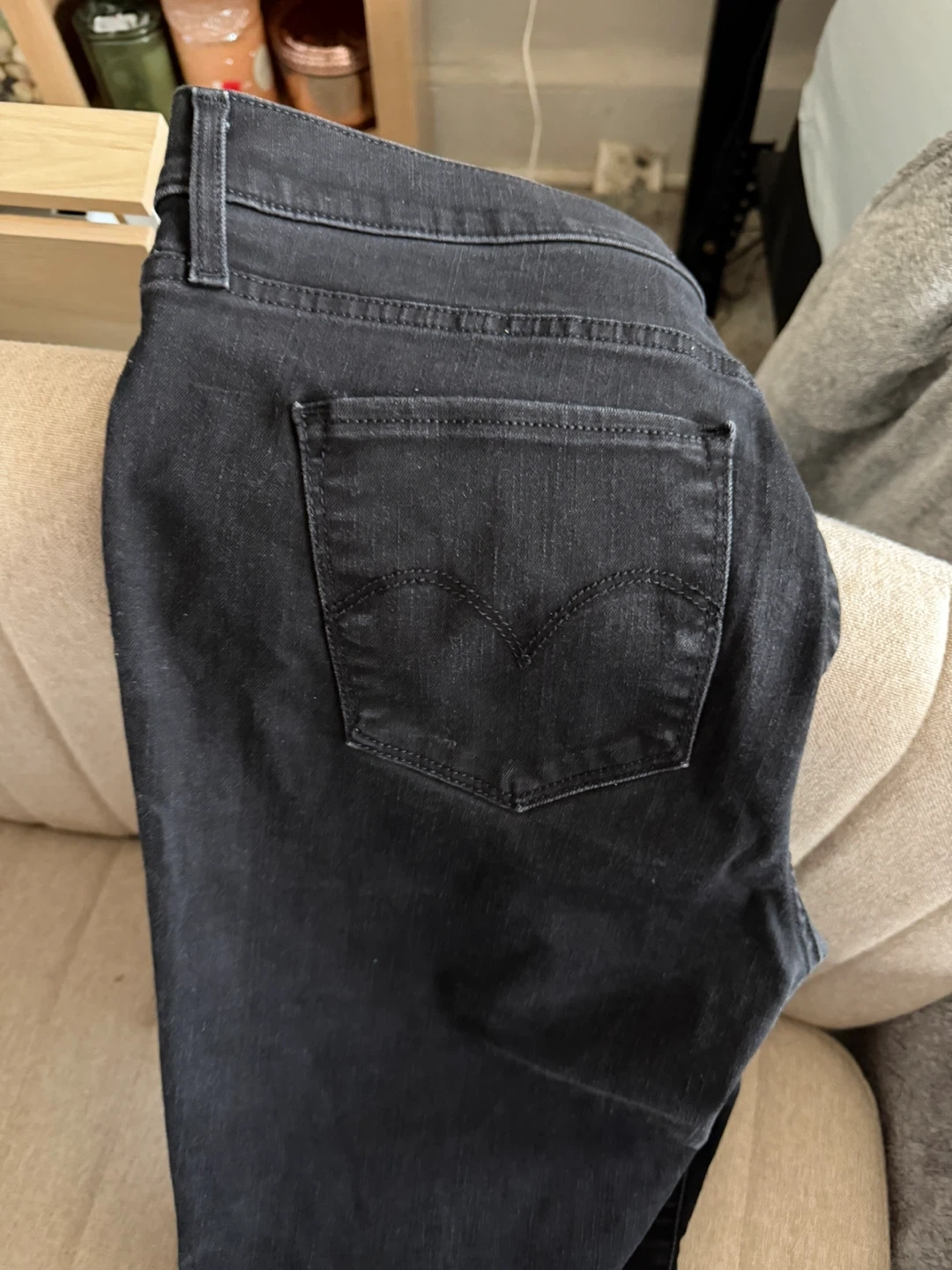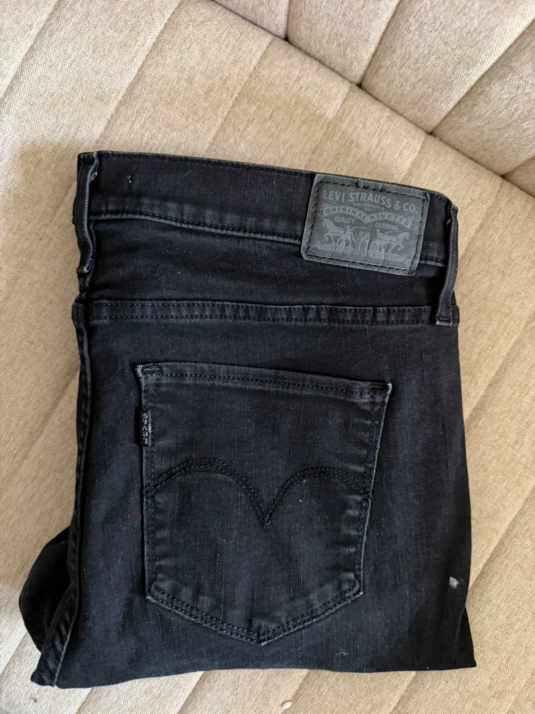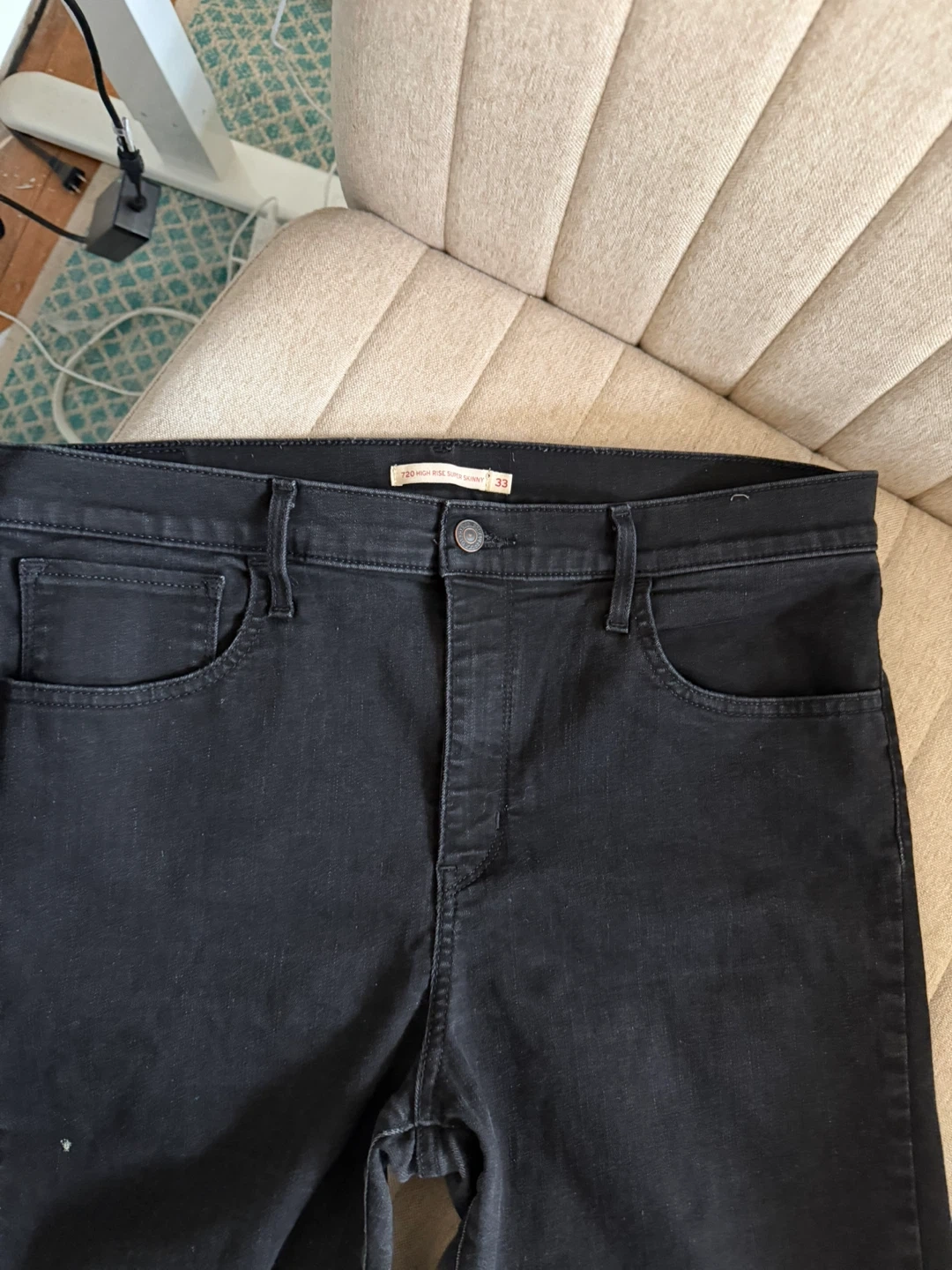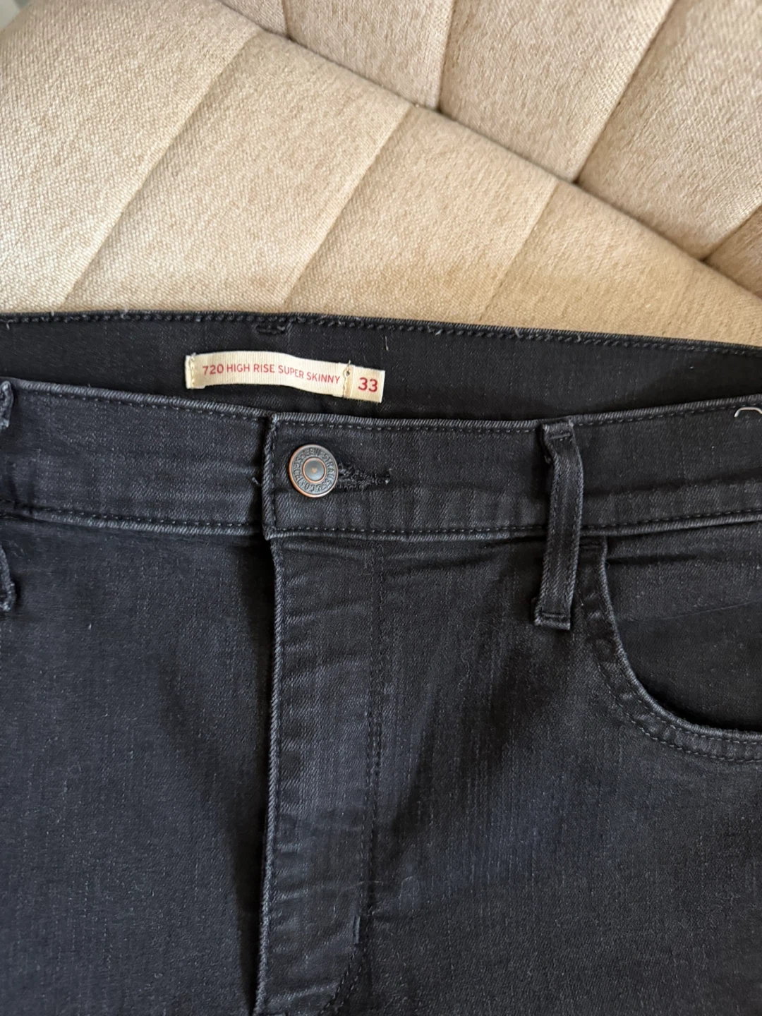 Black Levi's 720 High Rise Super Skinny jeans. Classic five-pocket styling. Button and zip fly closure. Size is 33.