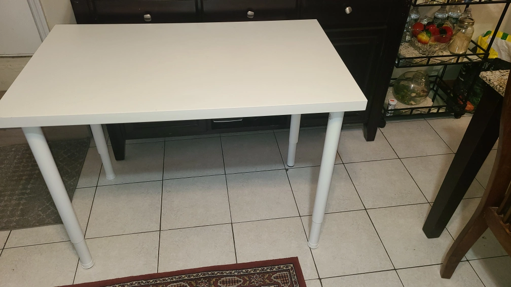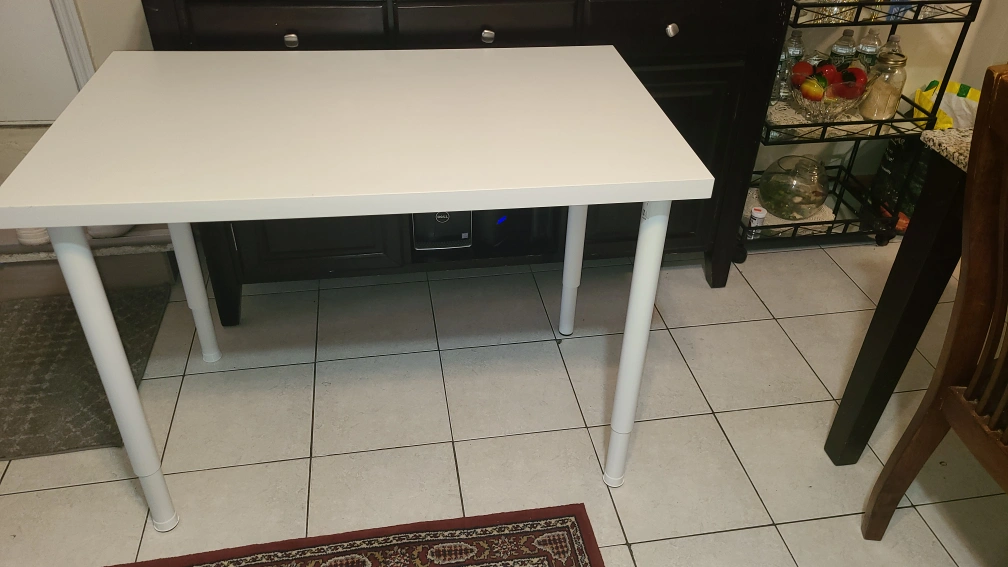 Small white table. Good condition. Simple design. Easy assembly. Perfect for small spaces. Great as a desk or kitchen table.